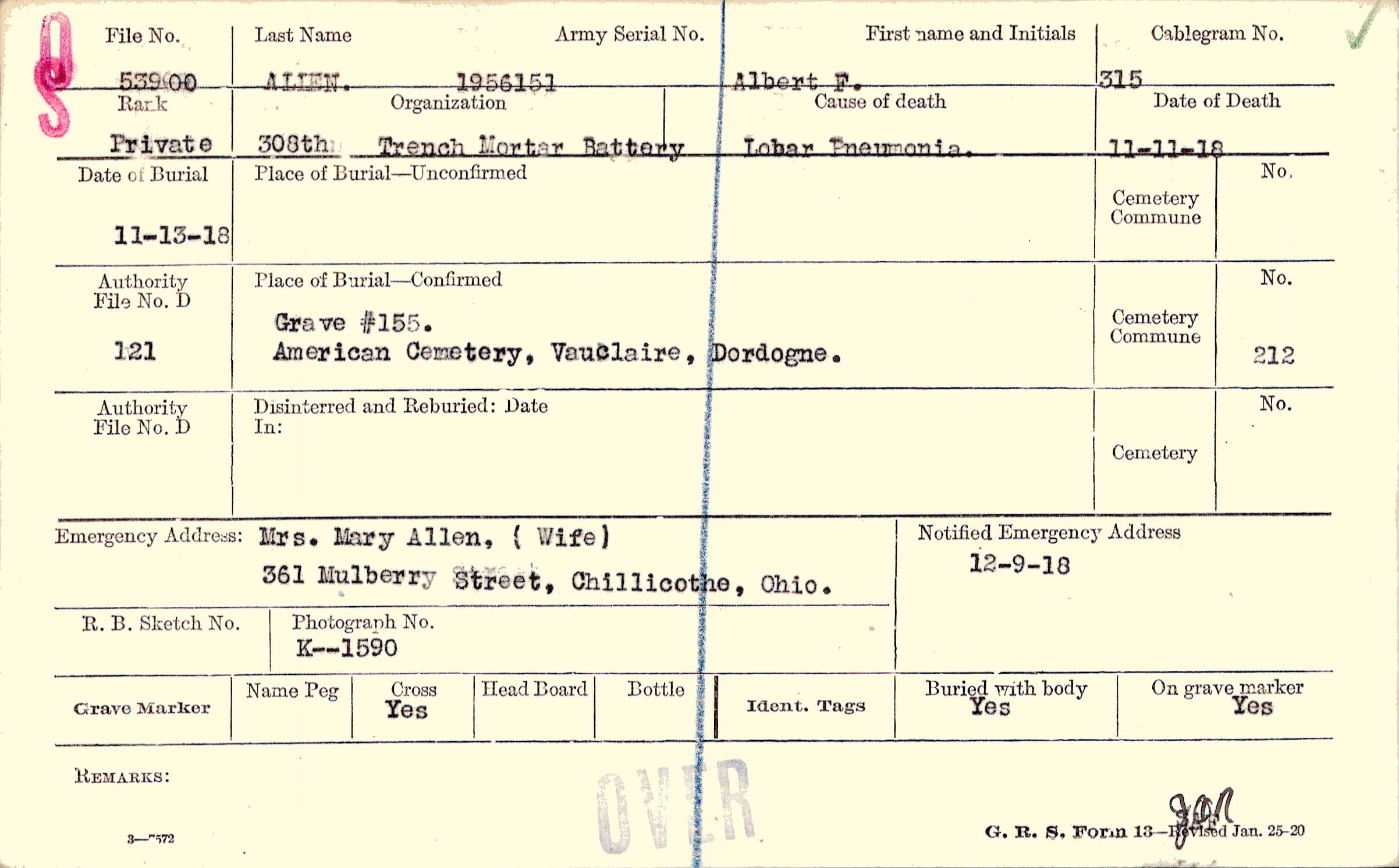 Mrs. Mary Allen, ( Wife), 361 Mulberry Street, Chillicothe, Ohio.