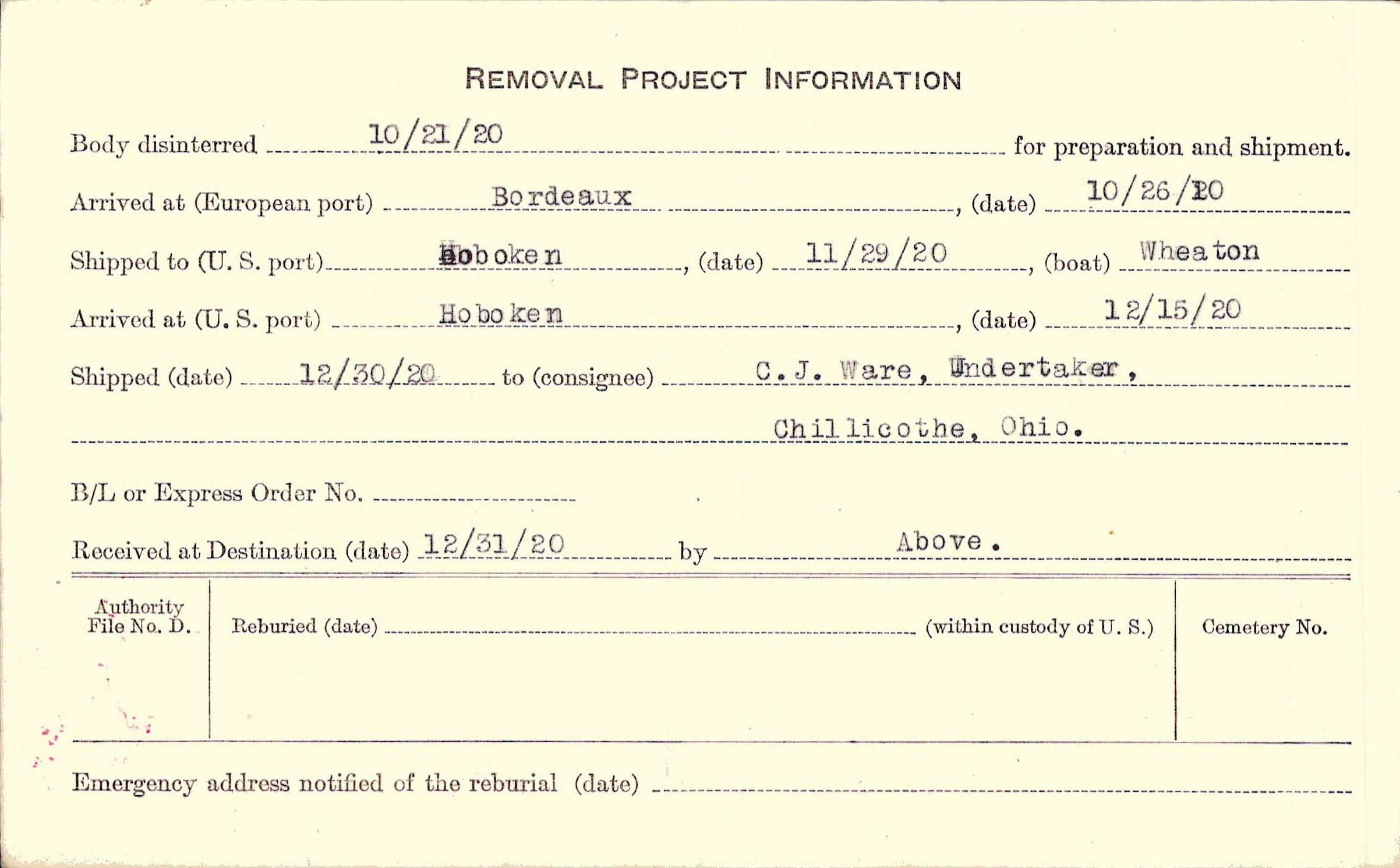 Body disinterred 10/21/1920 for preparation and shipment.