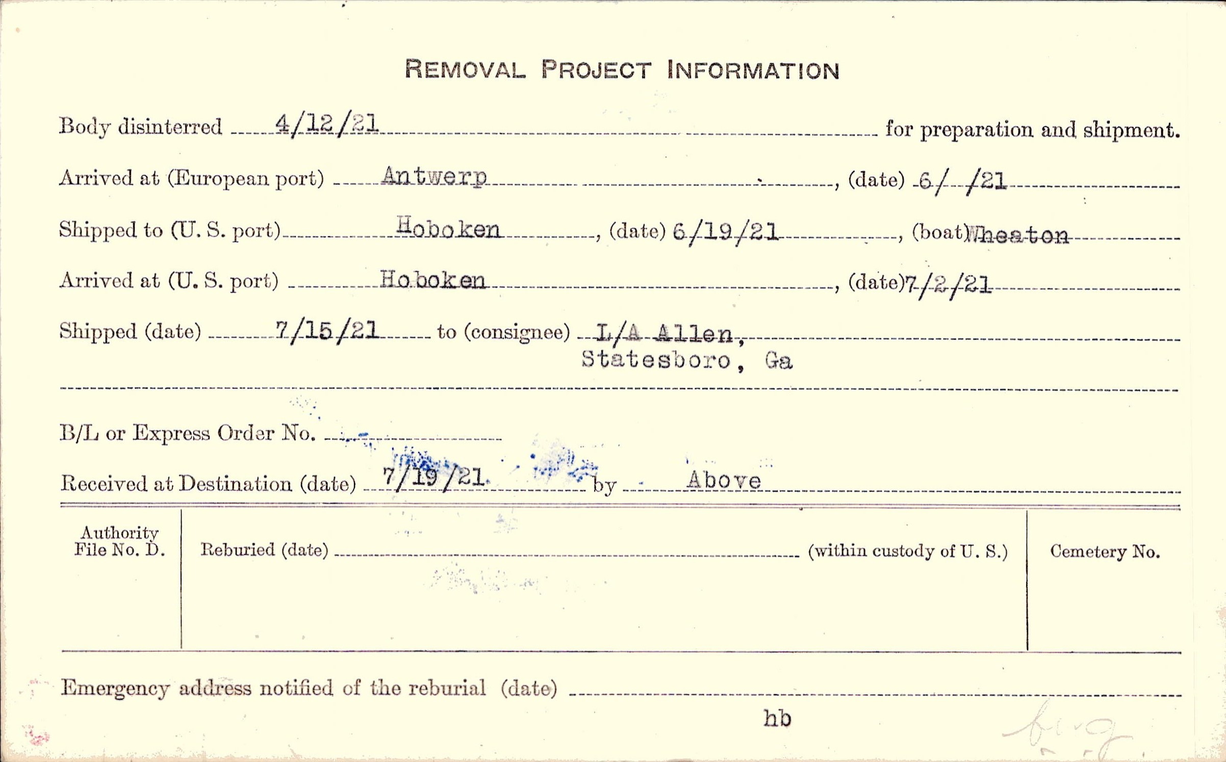 Body disinterred 4/12/1921 for preparation and shipment.