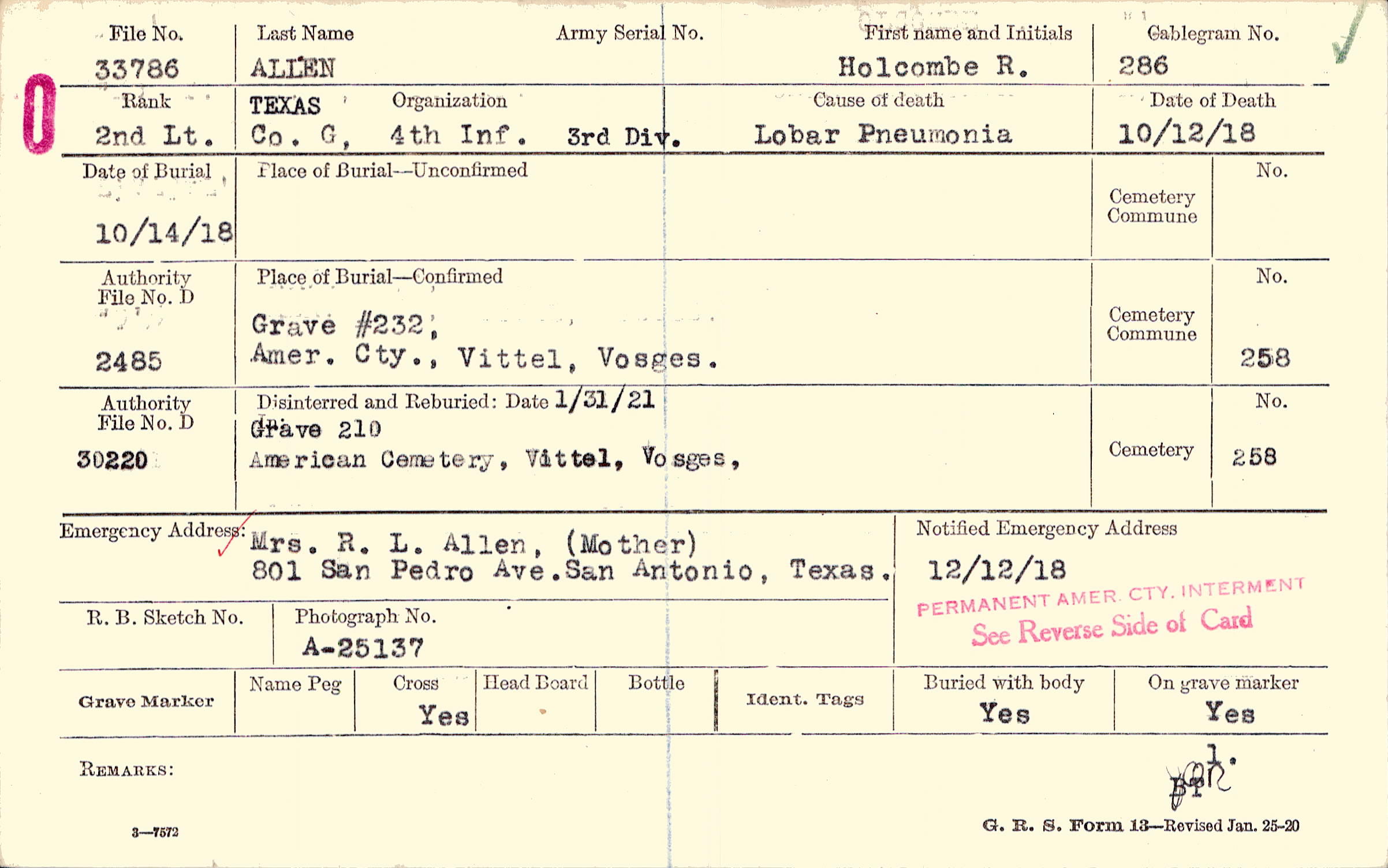 Mrs. R. L. Allen, (Mother), 801 San Pedro Ave.San Antonio, Texas.