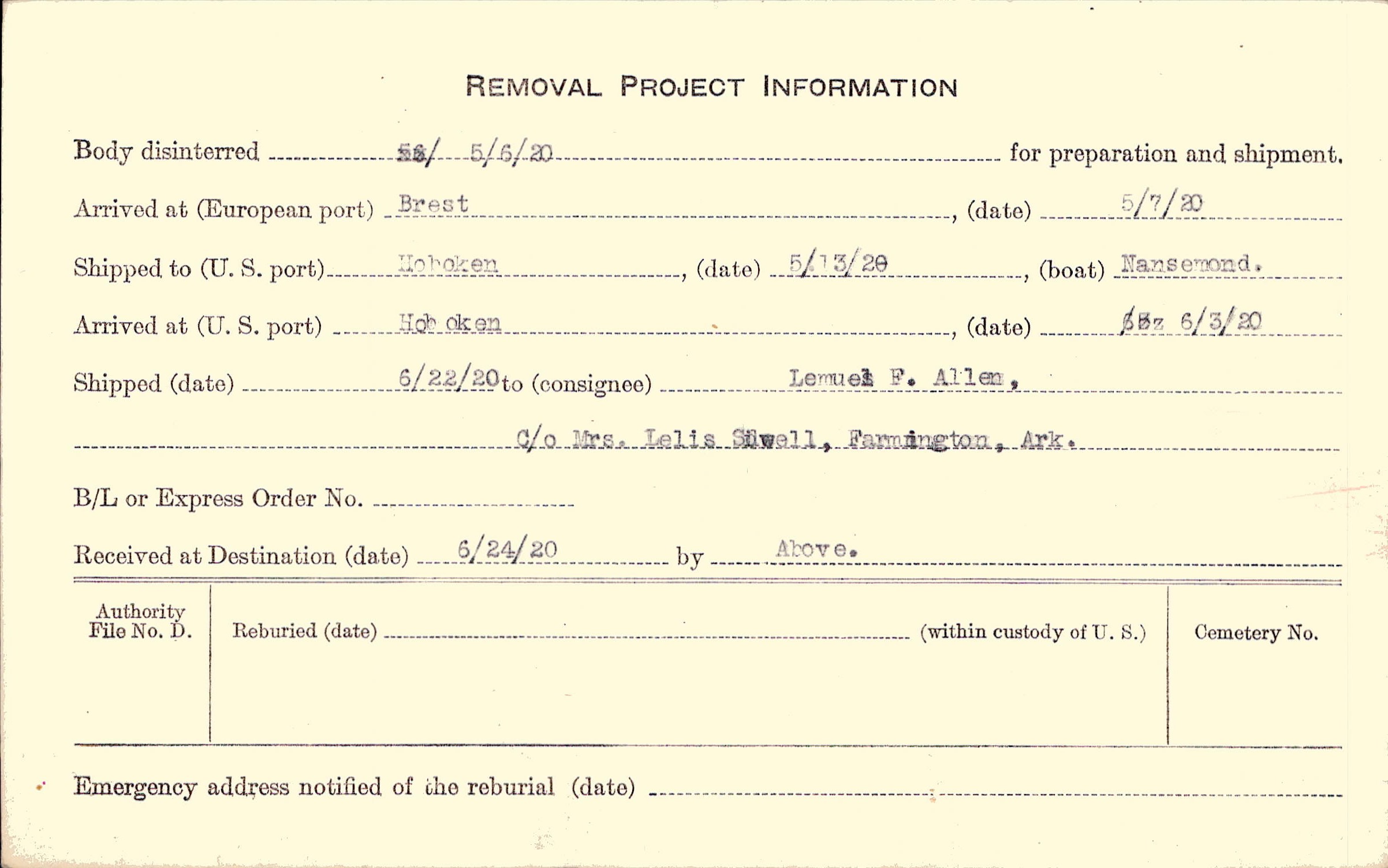 to Lemuel F. Allen, C/o Mrs. Lelis Sidwell, Farmington, Ark.