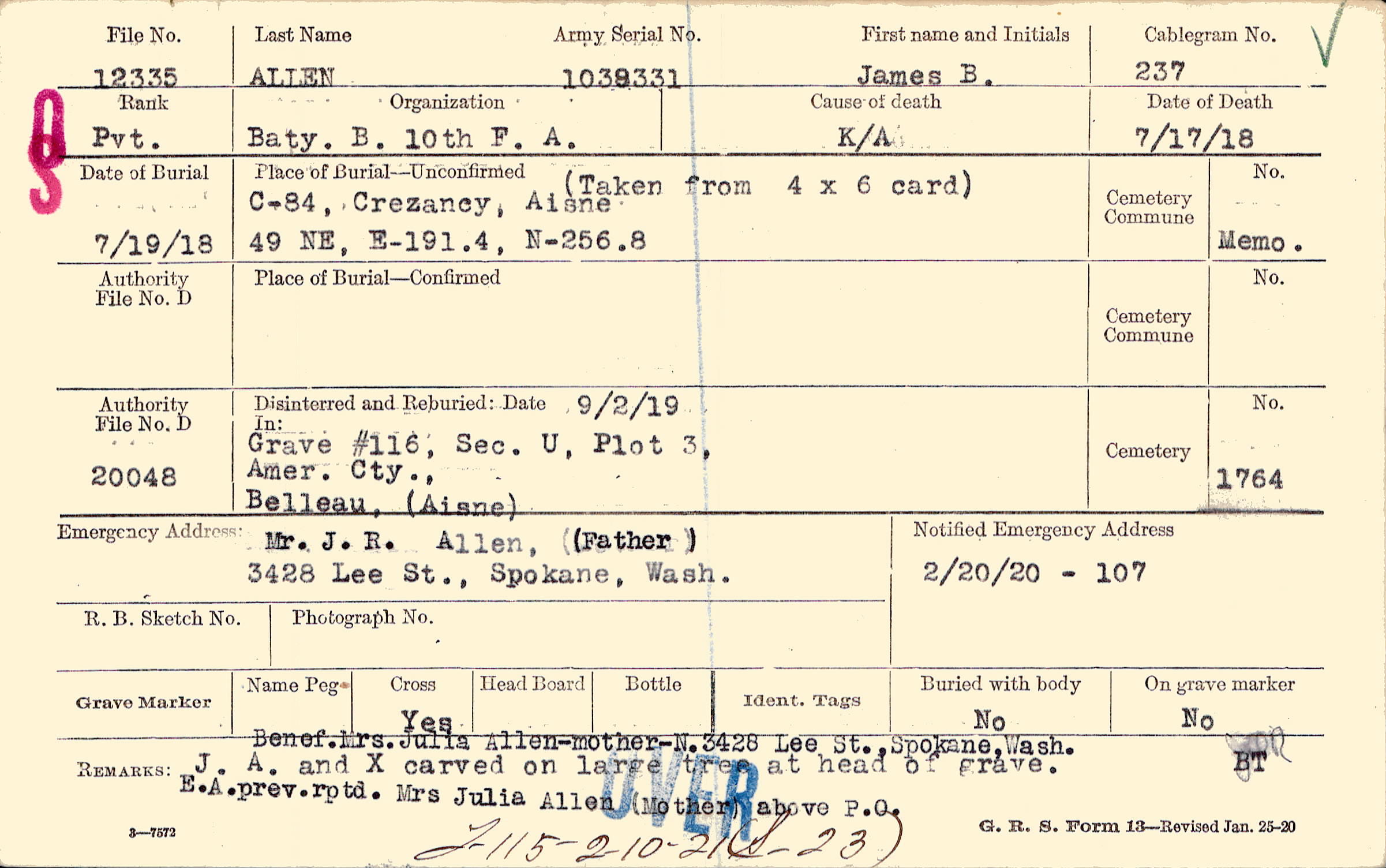 Benef.Mrs.Julia Allen-mother-N.3428 Lee St., Spokane,Wash. J. A. and X carved on large tree at head of grave. E.A.prev.rptd. Mrs. Julia Allen (Mother) above P.O., F115 - 2-10-21 (S_23)