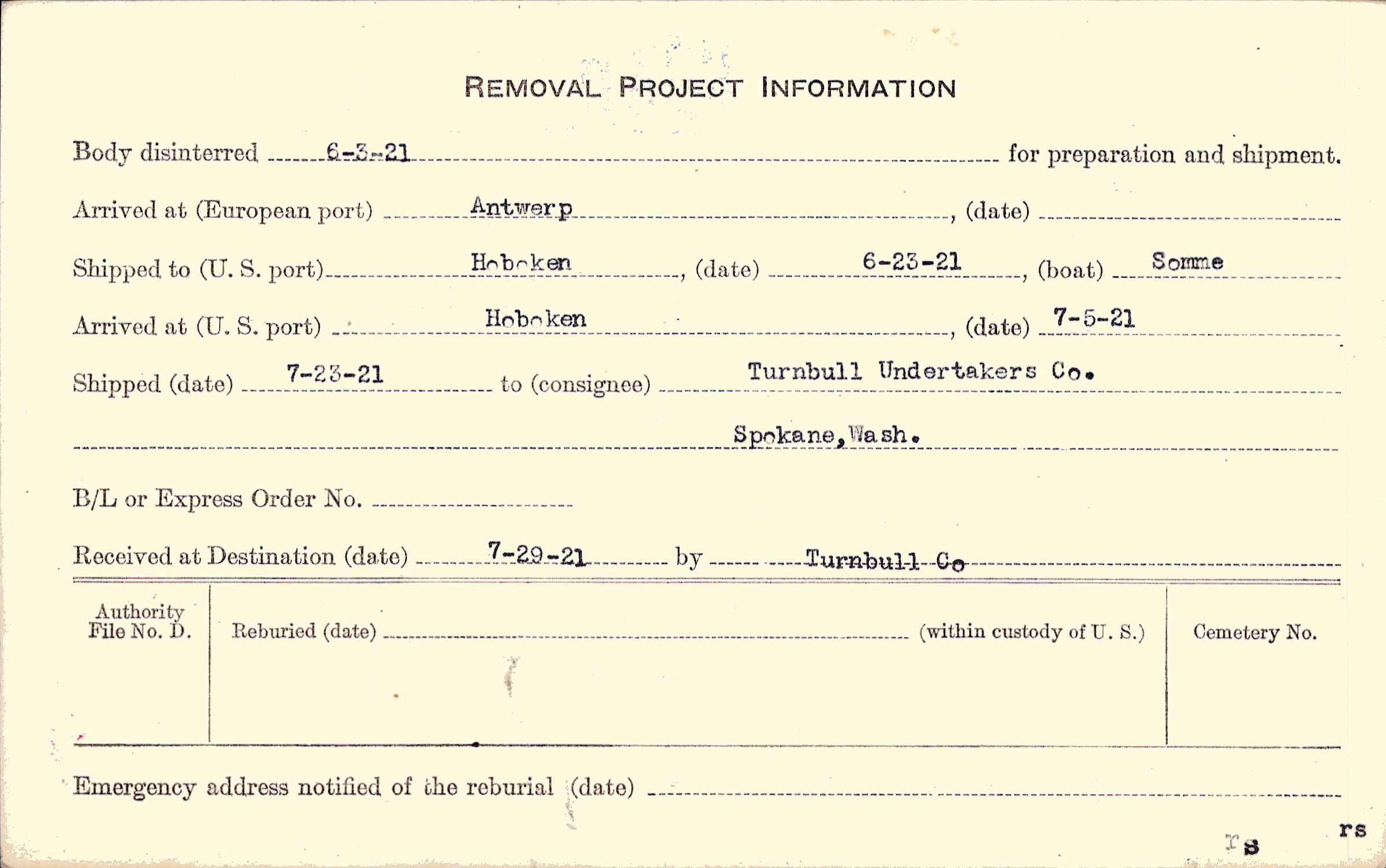 Body disinterred 6/3/1921 for preparation and shipment.