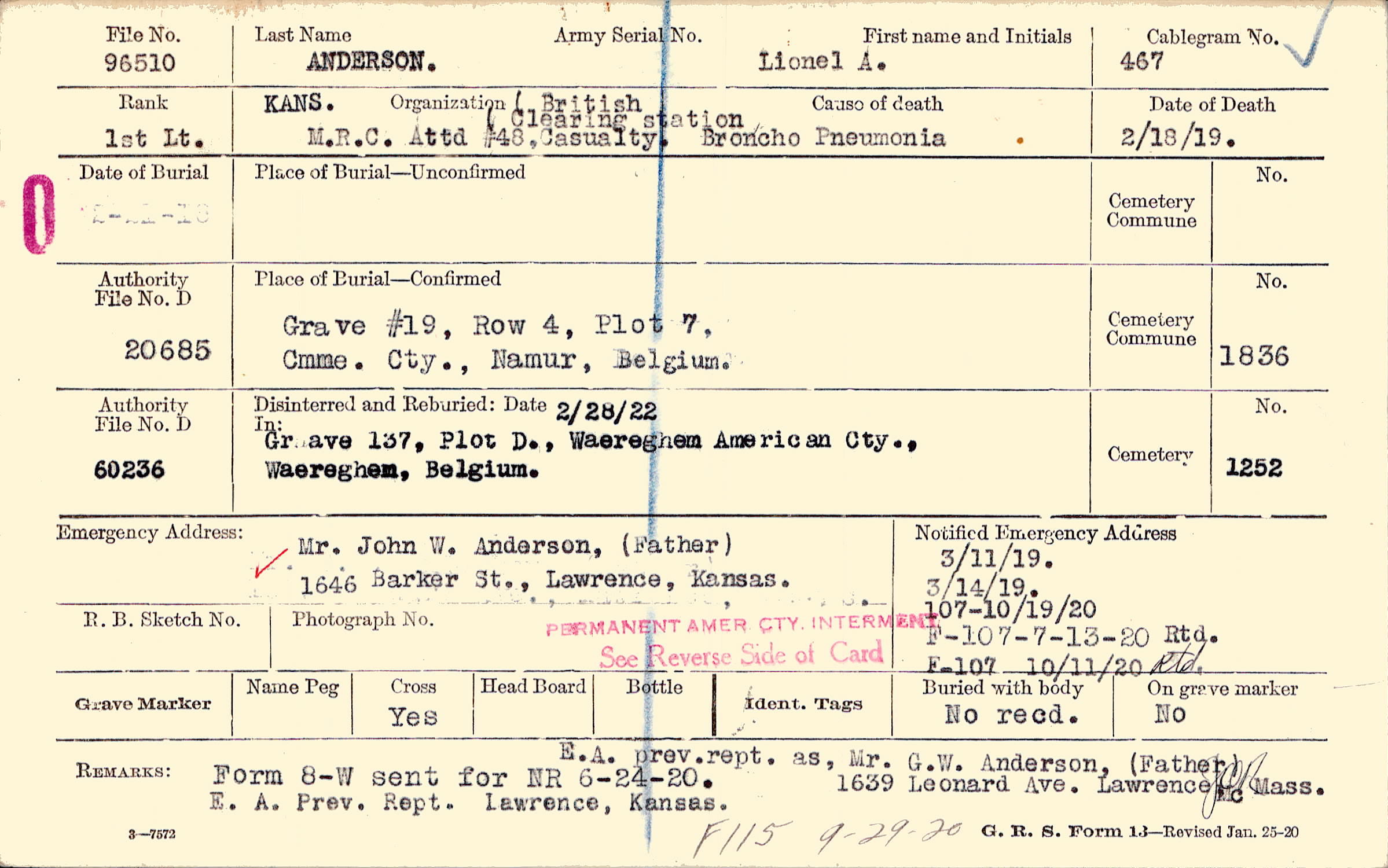 E.A. prev.rept. as, Mr. G.W. Anderson,(Father) 1639 Leonard Ave. Lawrence, Mass., Form 8-W sent for NR 6-24-20., F115 9-29-20