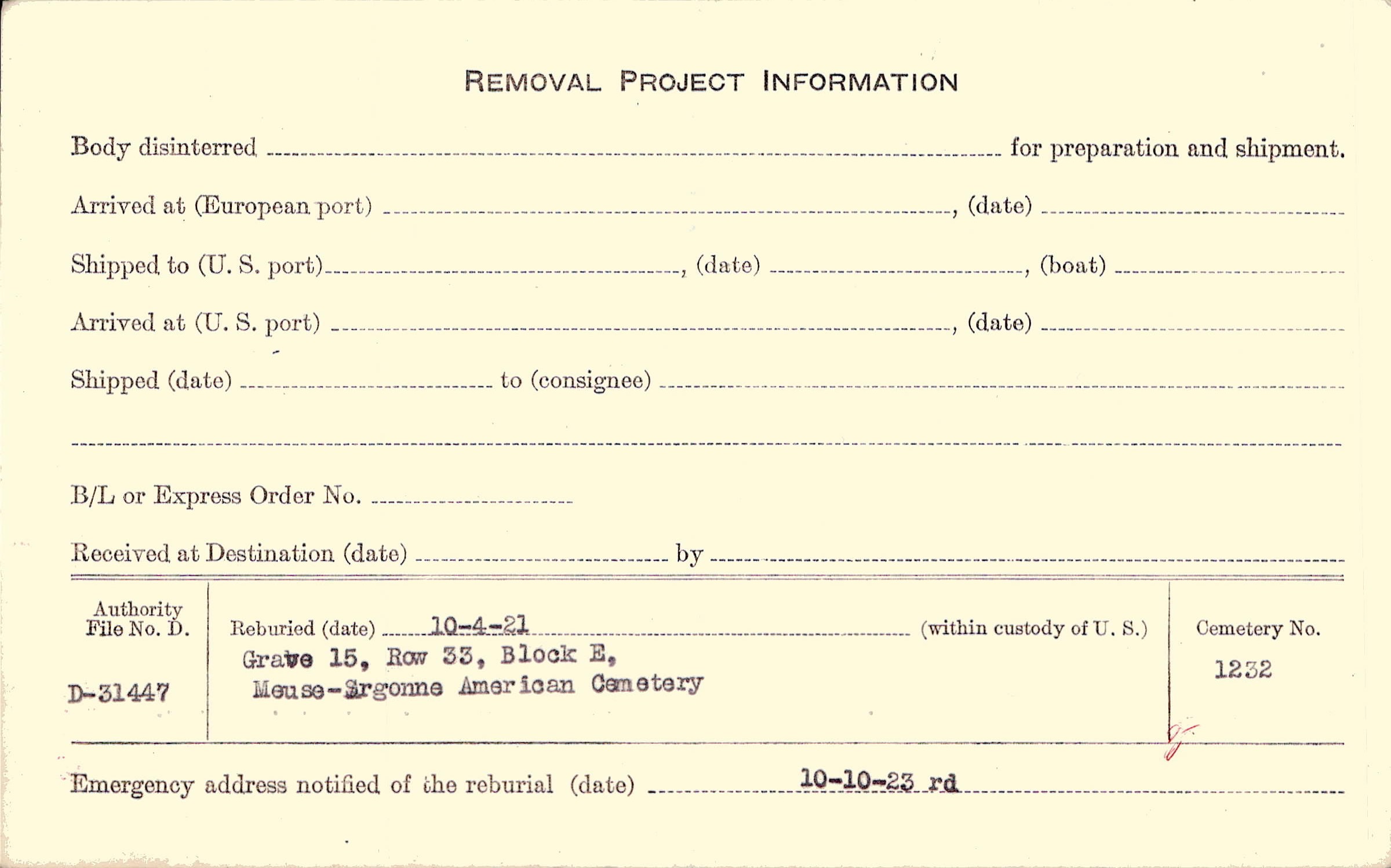 | Permanent Burial in Foreign Cemetery |