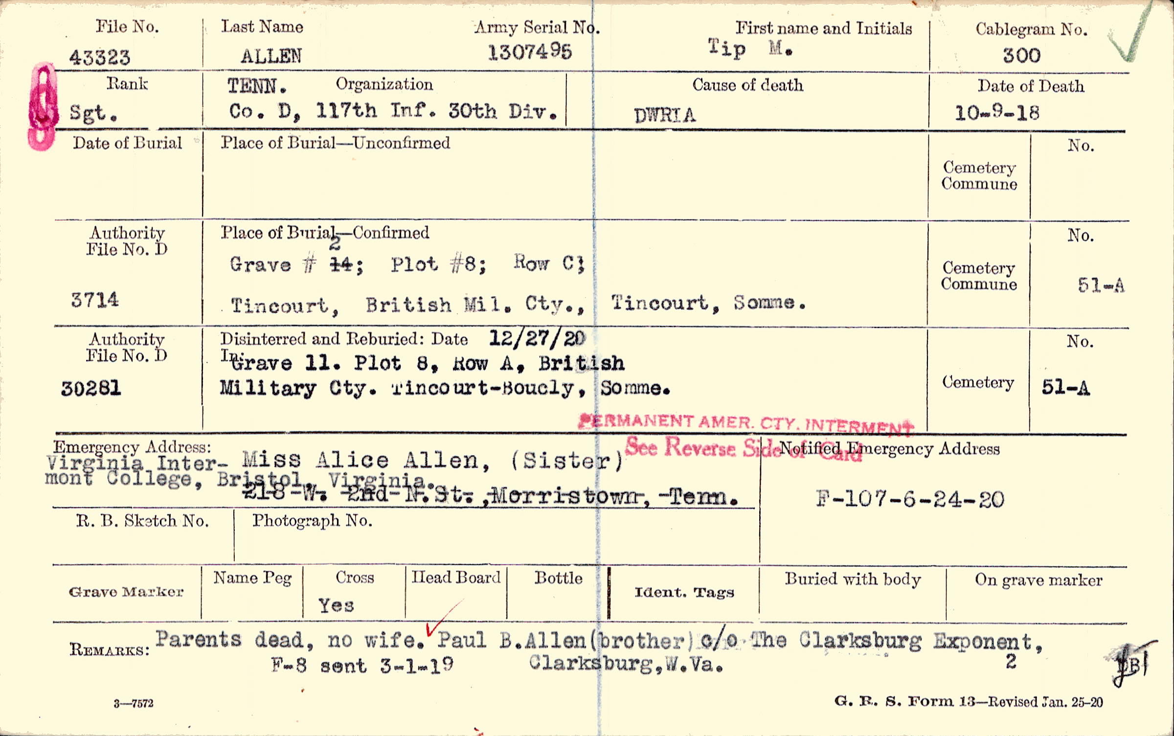 Parents dead, no wife. Paul B. Allen (brother) c/o The Clarksburg Exponent, Clarksburg, W. Va., F-8 sent 3-1-19