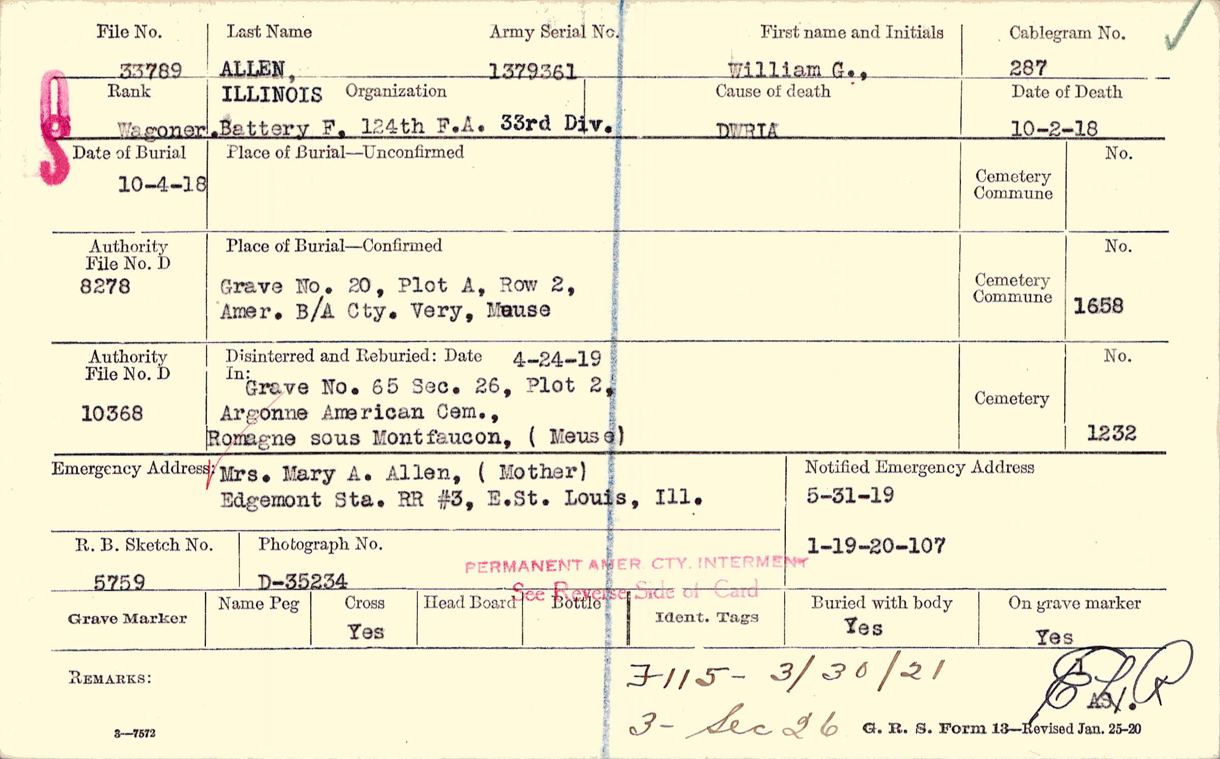 Mrs. Mary A. Allen, (Mother), Edgemont Sta. RR #3, E.St. Louis, Ill.