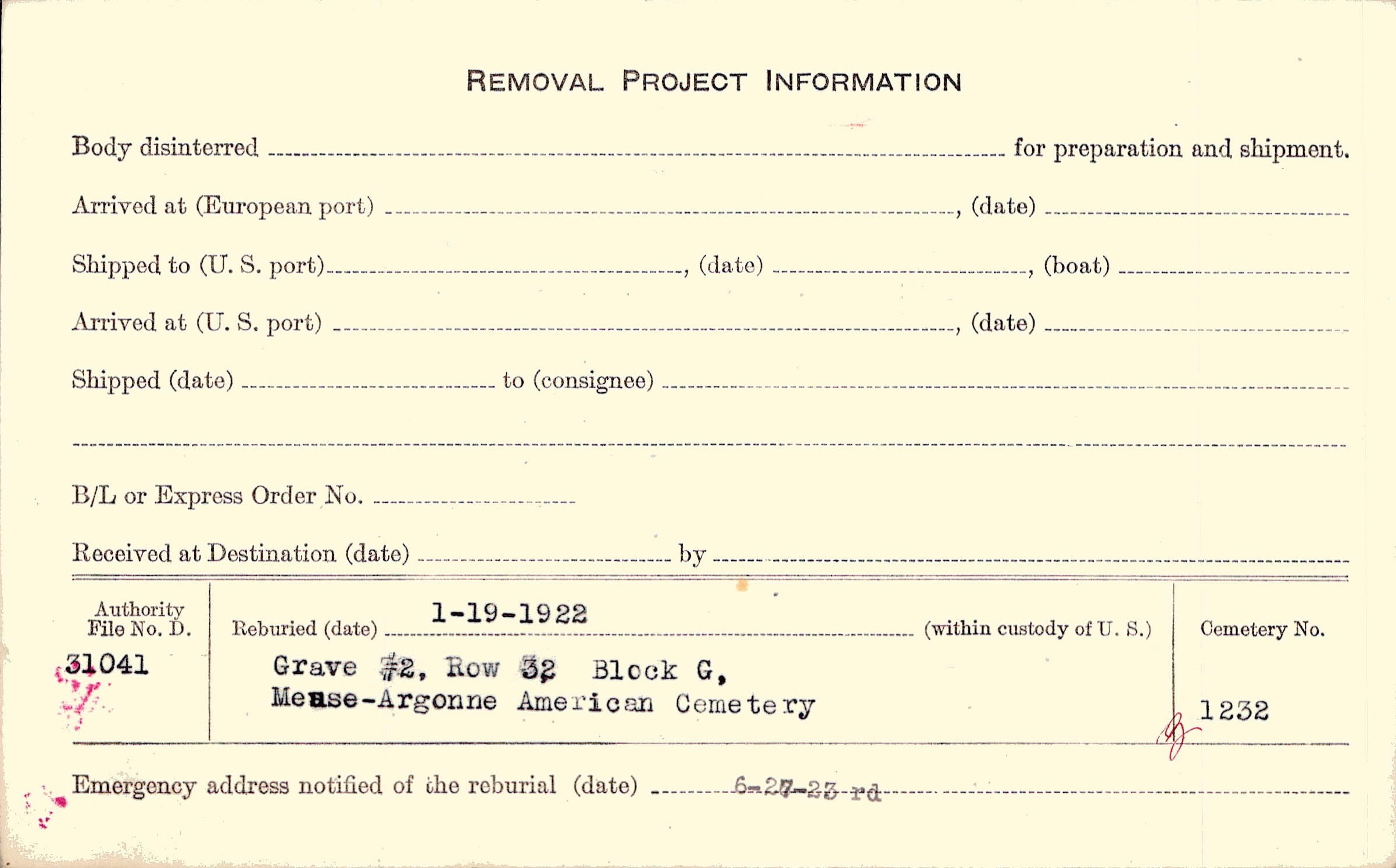 | Permanent Burial in Foreign Cemetery |