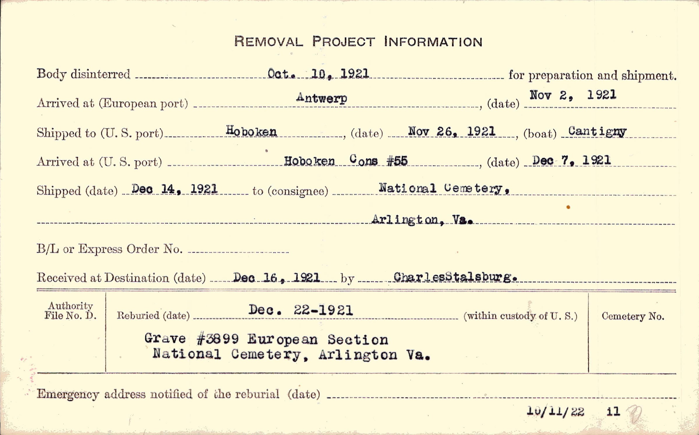 Body disinterred 10/10/1921 for preparation and shipment.