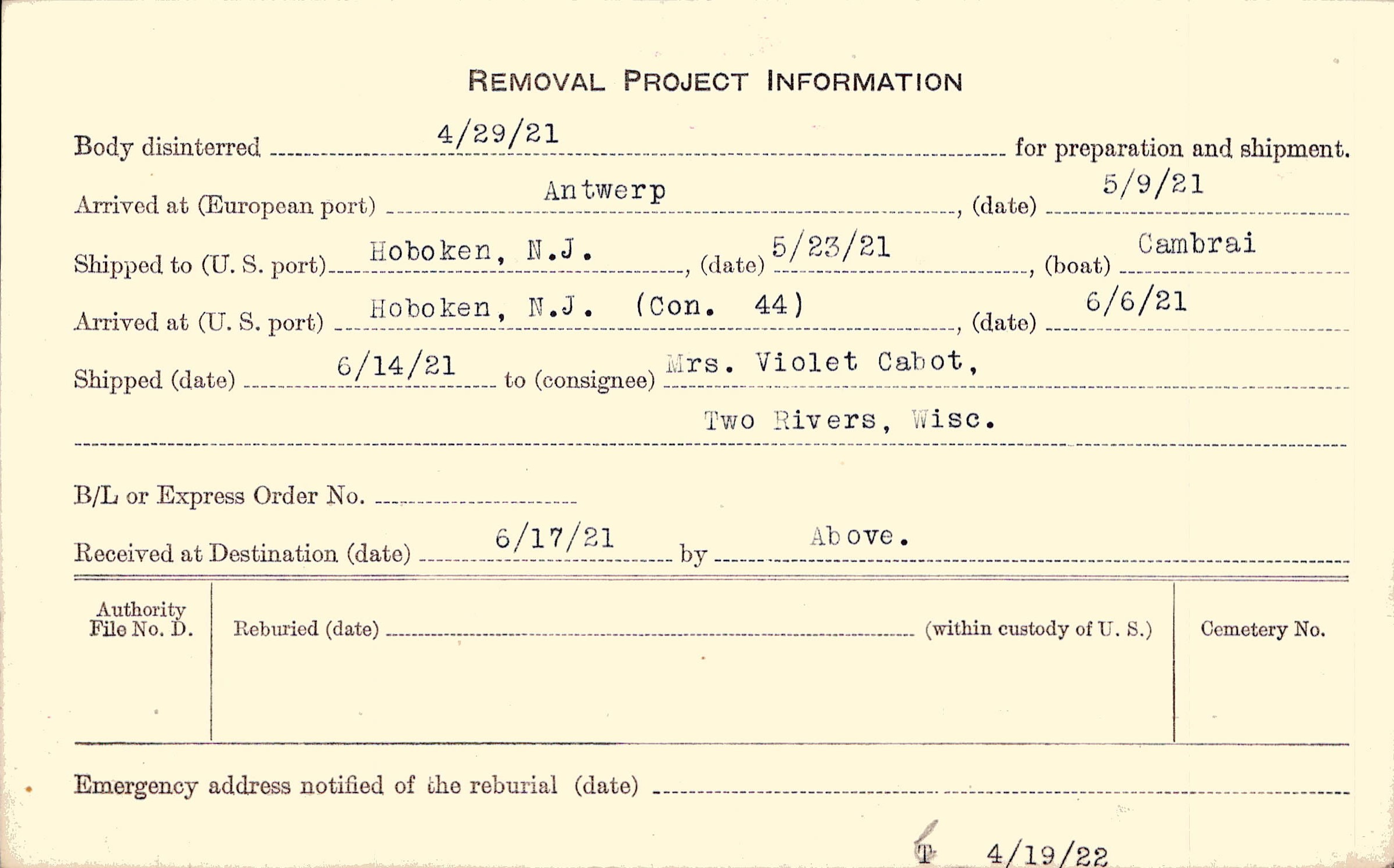 Body disinterred 4/29/1921 for preparation and shipment.