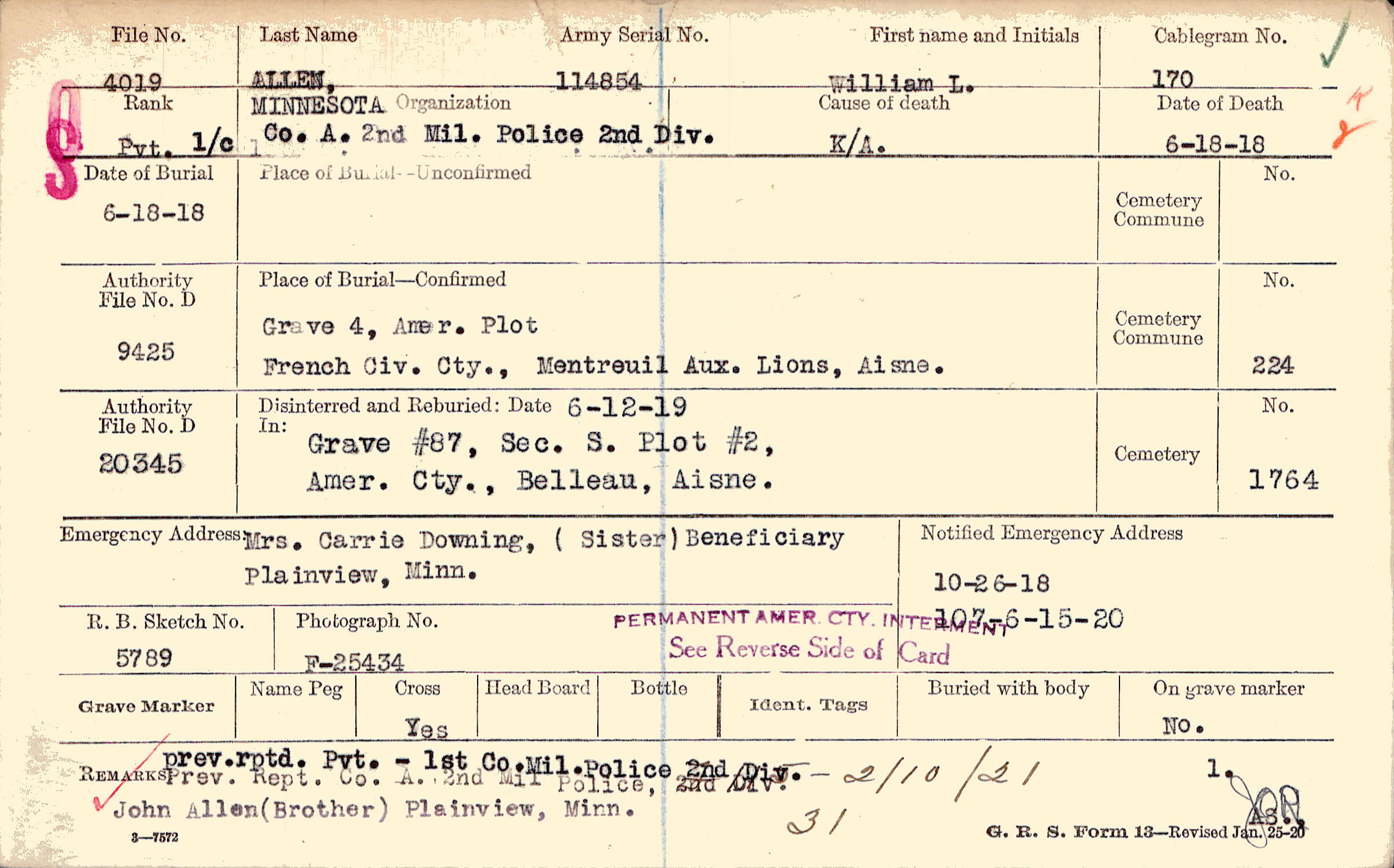 prev. rptd. Pvt. - 1st Co. Mil. Police 2nd Div. Prev. Rept. Co. A 2nd Mil Police, 2nd Div. John Allen (Brother) Plainview, Minn., F115 - 2/10/21 31