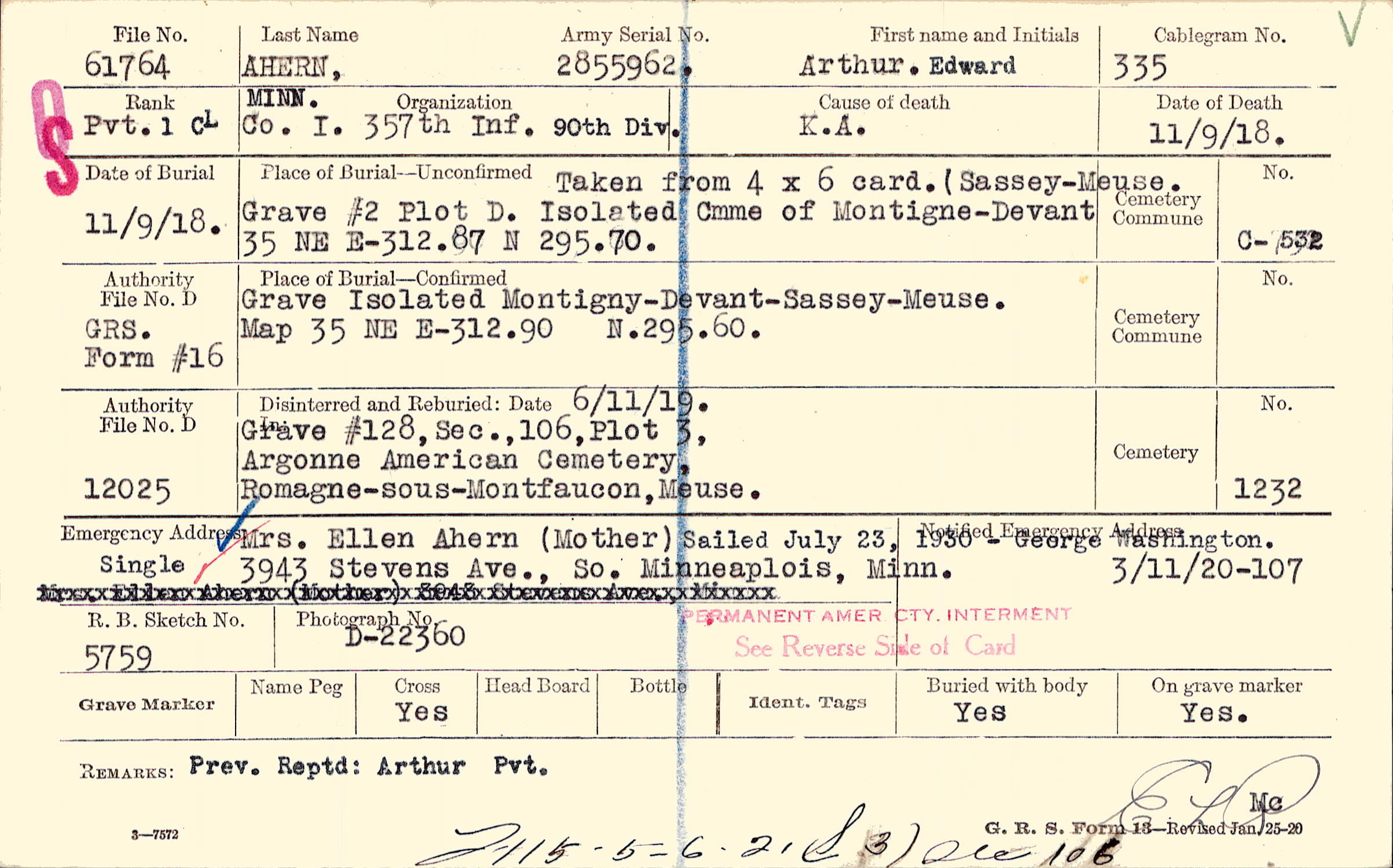Mrs. Ellen Ahern (Mother), 3943 Stevens Ave., so. Minneapolis, Minn., Single Sailed July 23, 1930 - George Washington Permanent Amer. Cty. Interment See Reverse Side of Card