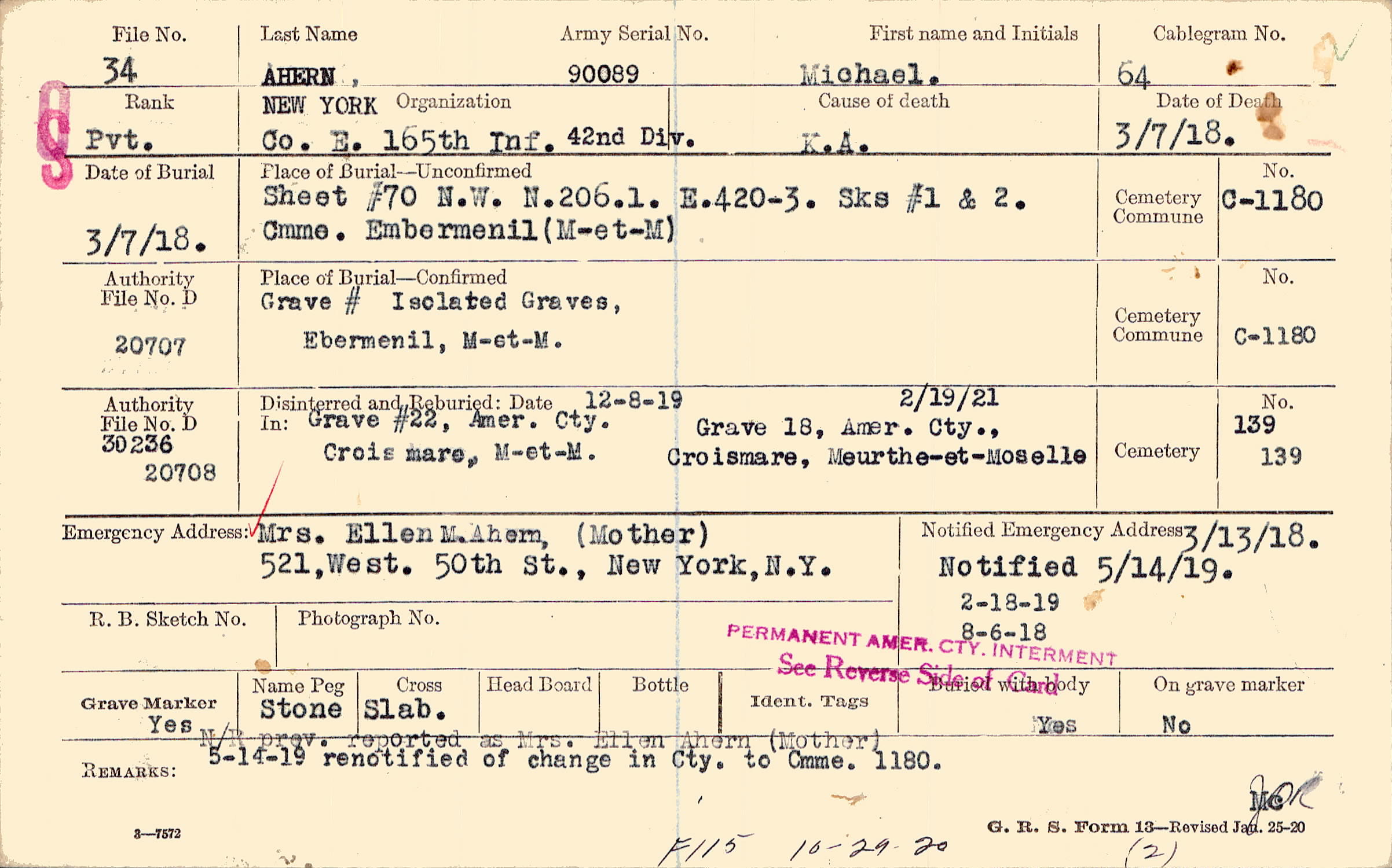 N/R prev. reported as Mrs. Ellen Ahern (Mother) 5-14-19 renotified of change in Cty. to Cmme. 1180.