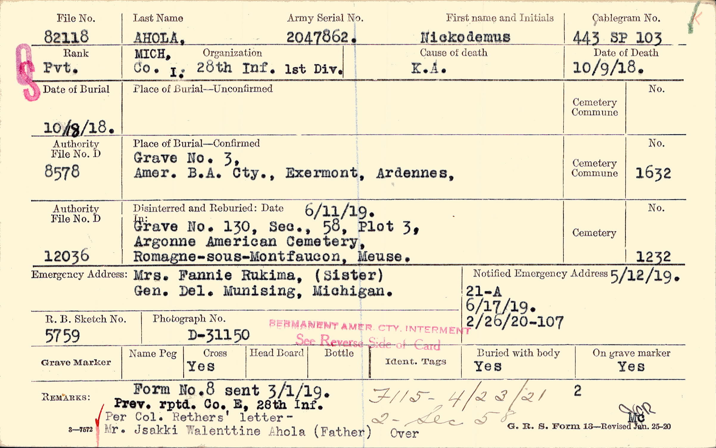 Prev. rptd. Co. E, 28th Inf. Per Col. Rethers' letter - Mr. Jsakki Walenttine Ahola (Father) Over, Form No. 8 sent 3/1/19., F115 - 4/23/21 2 - Sec 58