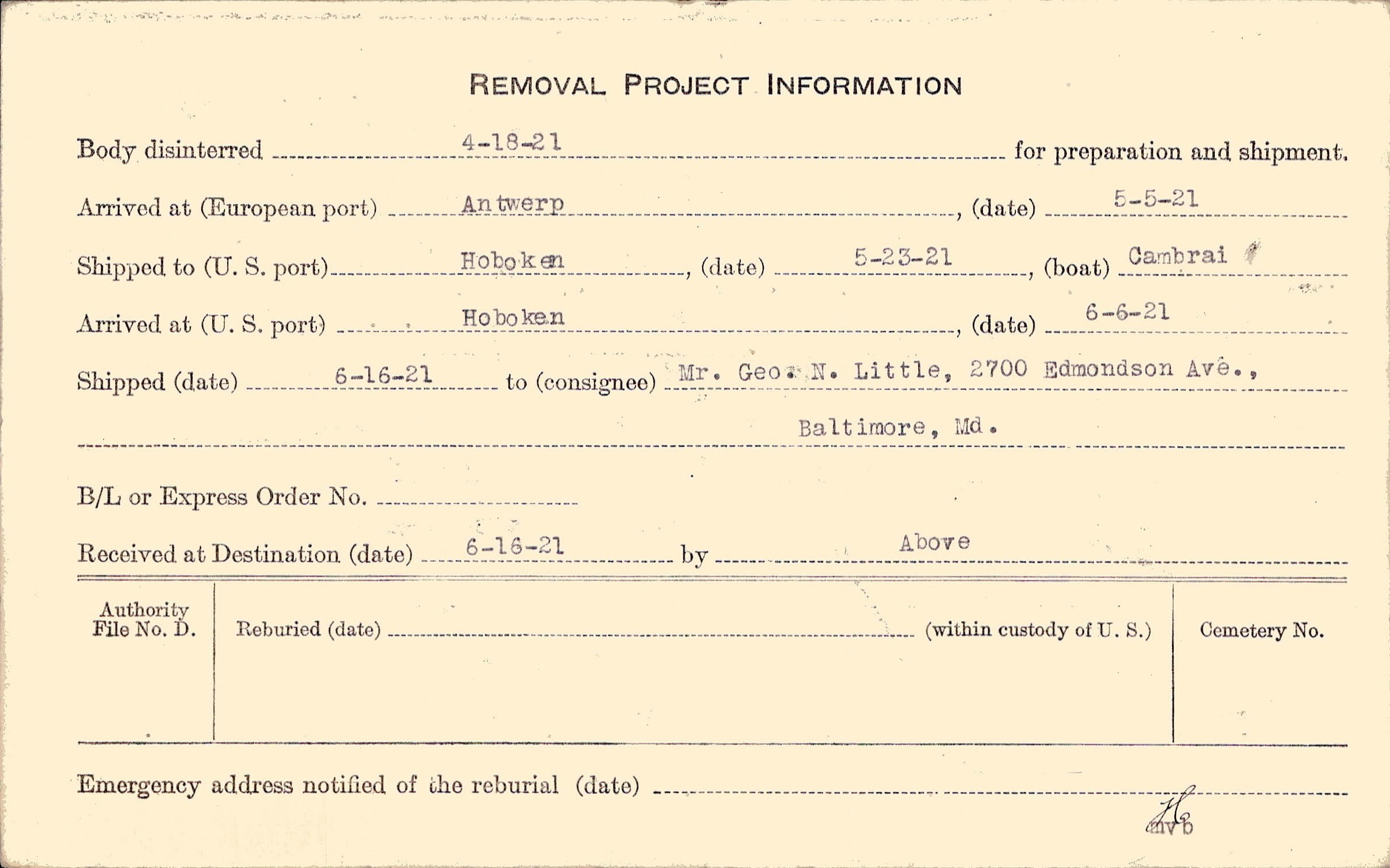 Body disinterred 4/18/1921 for preparation and shipment.