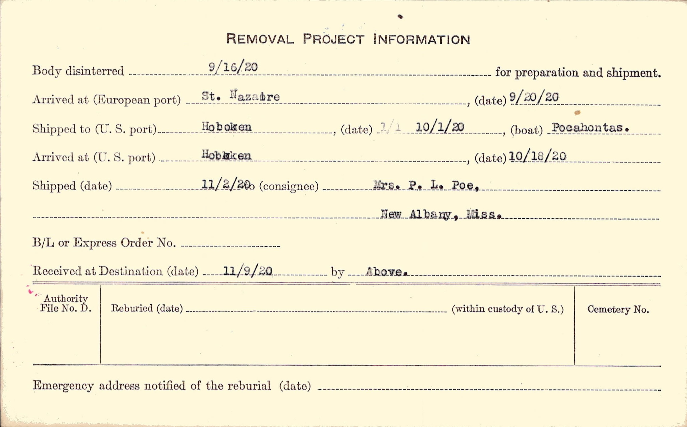 Body disinterred 9/16/1920 for preparation and shipment.