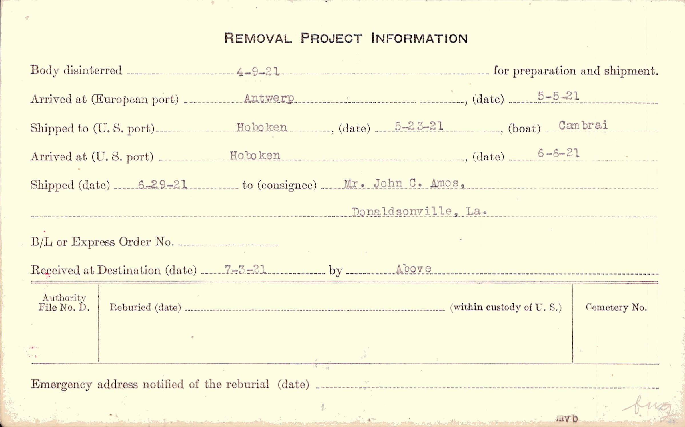 Body disinterred 4/9/1921 for preparation and shipment.