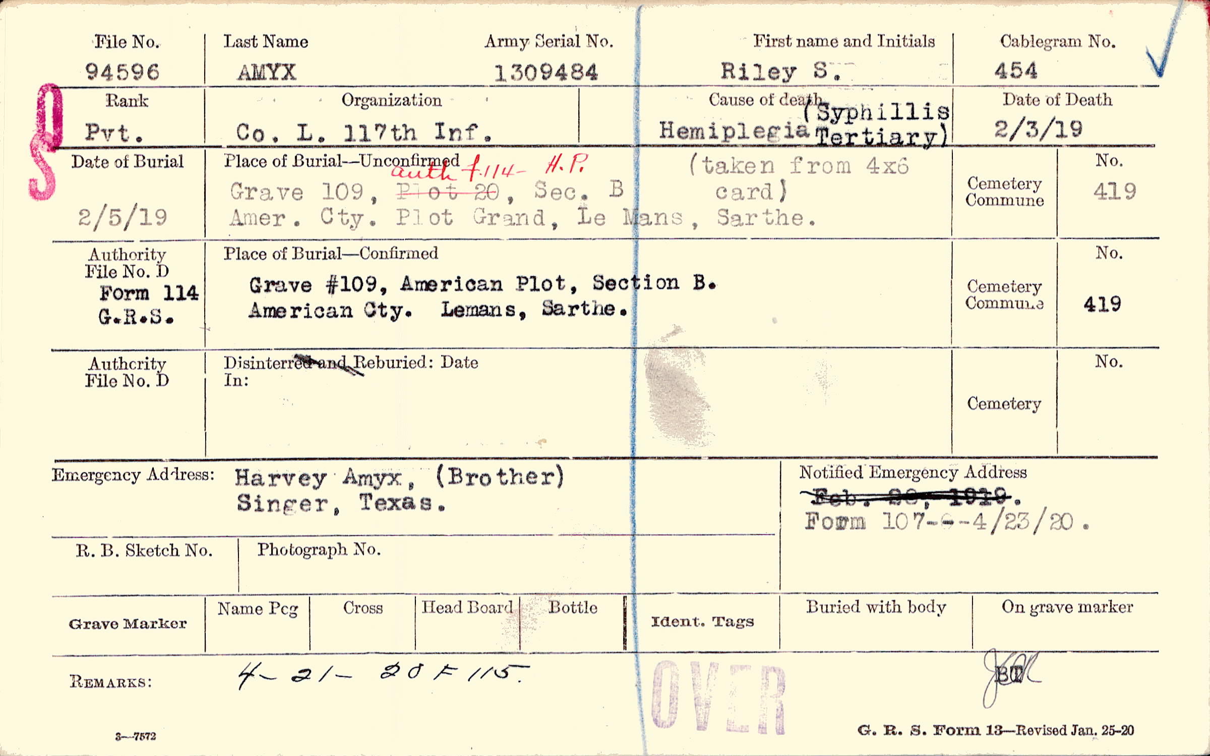 Grave #109, American Plot, Section B, American Cty., Lemans, Sarthe.