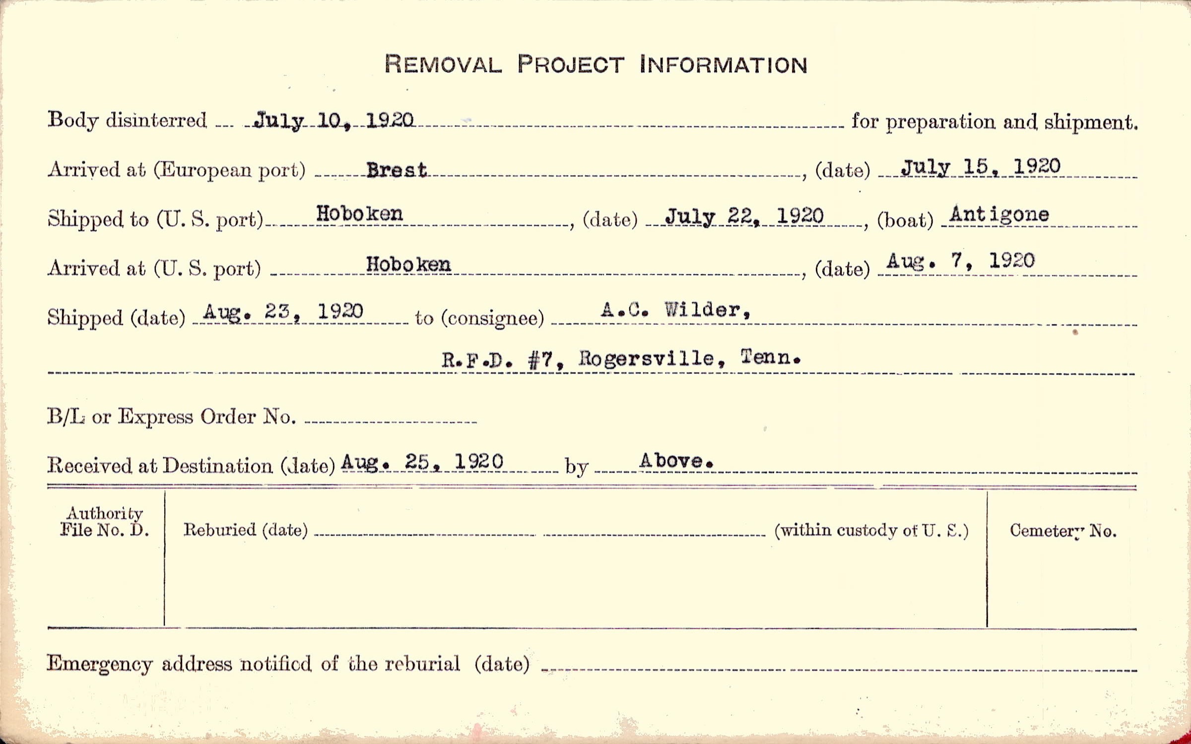 Body disinterred 7/10/1920 for preparation and shipment.