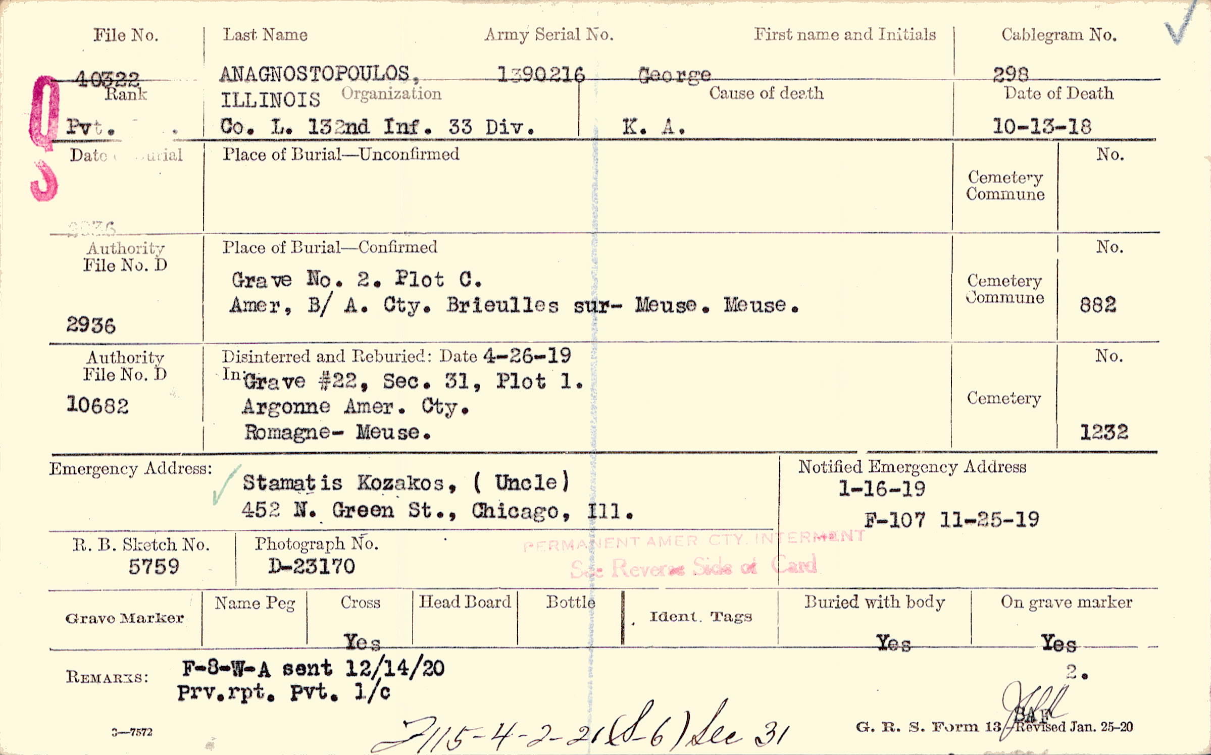 Stamatis Kozakos, (Uncle), 452 N. Green St., Chicago, Ill.