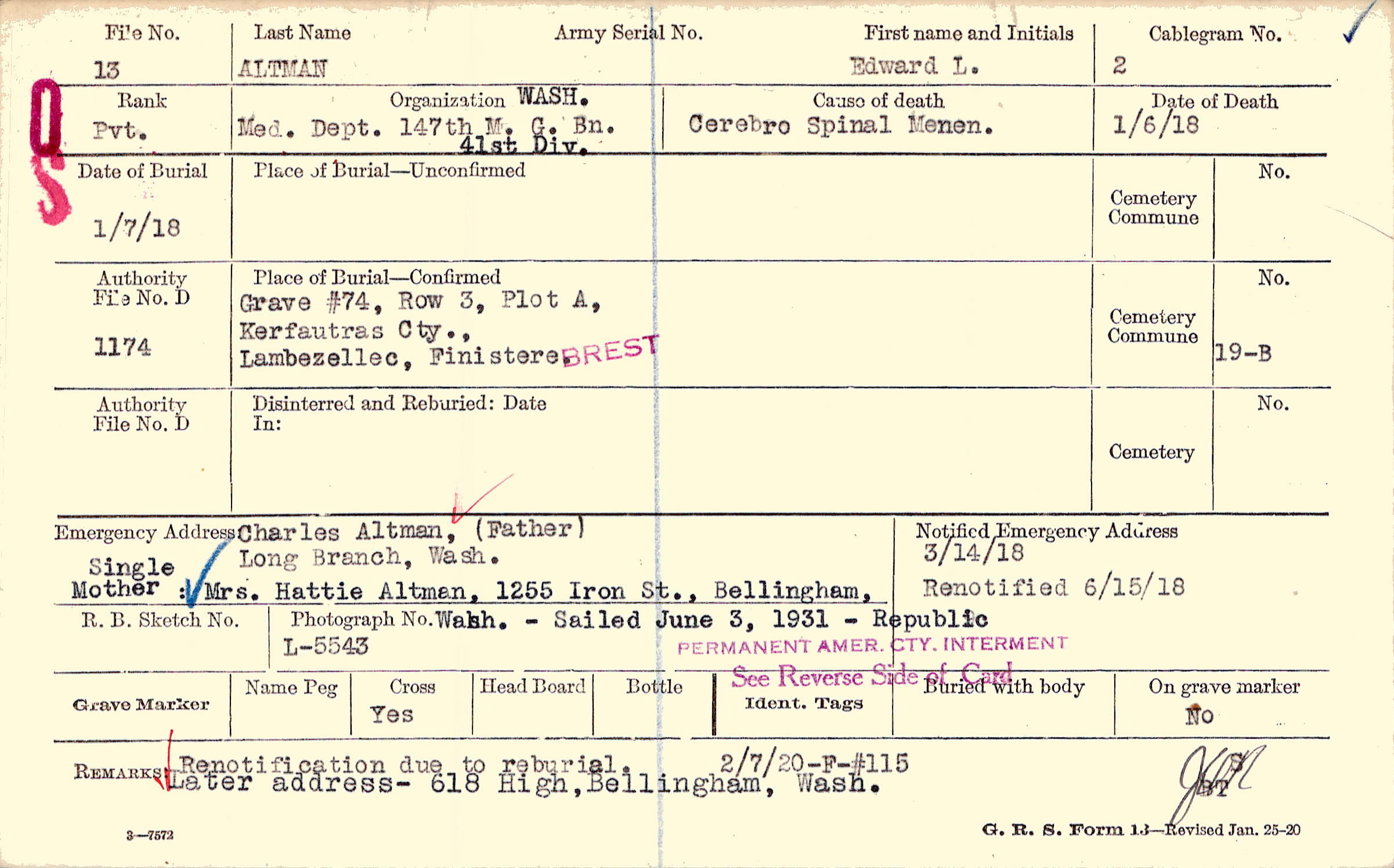 Renotification due to reburial. Later address - 618 High, Bellingham, Wash., Renotification due to reburial, 2/7/20 - F-#115