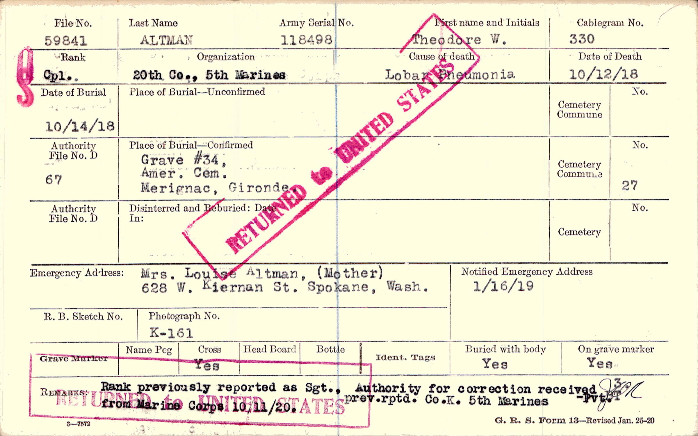Mrs. Louise Altman, (Mother), 628 W. Kiernan St. Spokane, Wash.