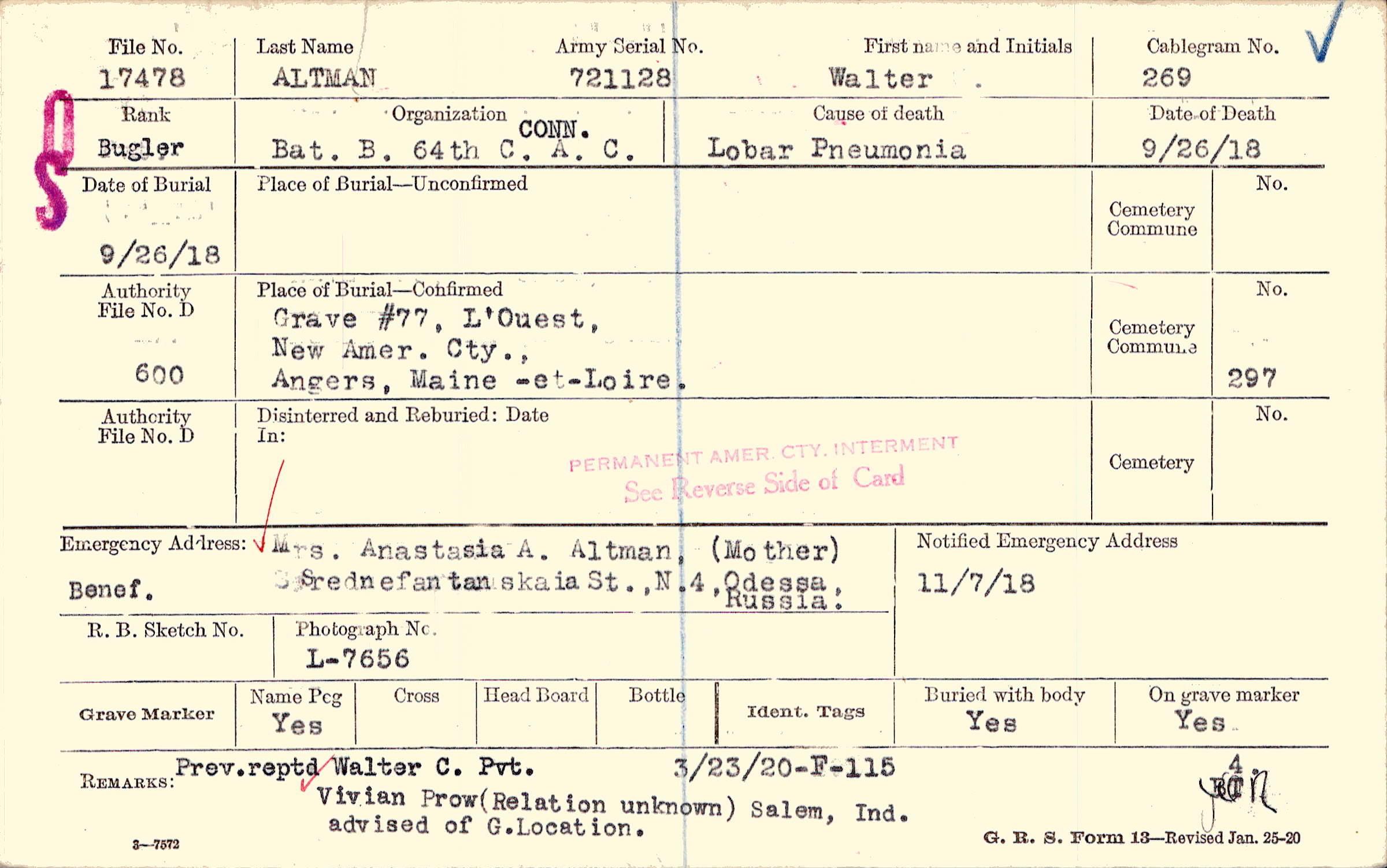 Mrs. Anastasia A. Altman, (Mother), Srednefantanskaia St., N.4, Odessa, Russia., Benef.