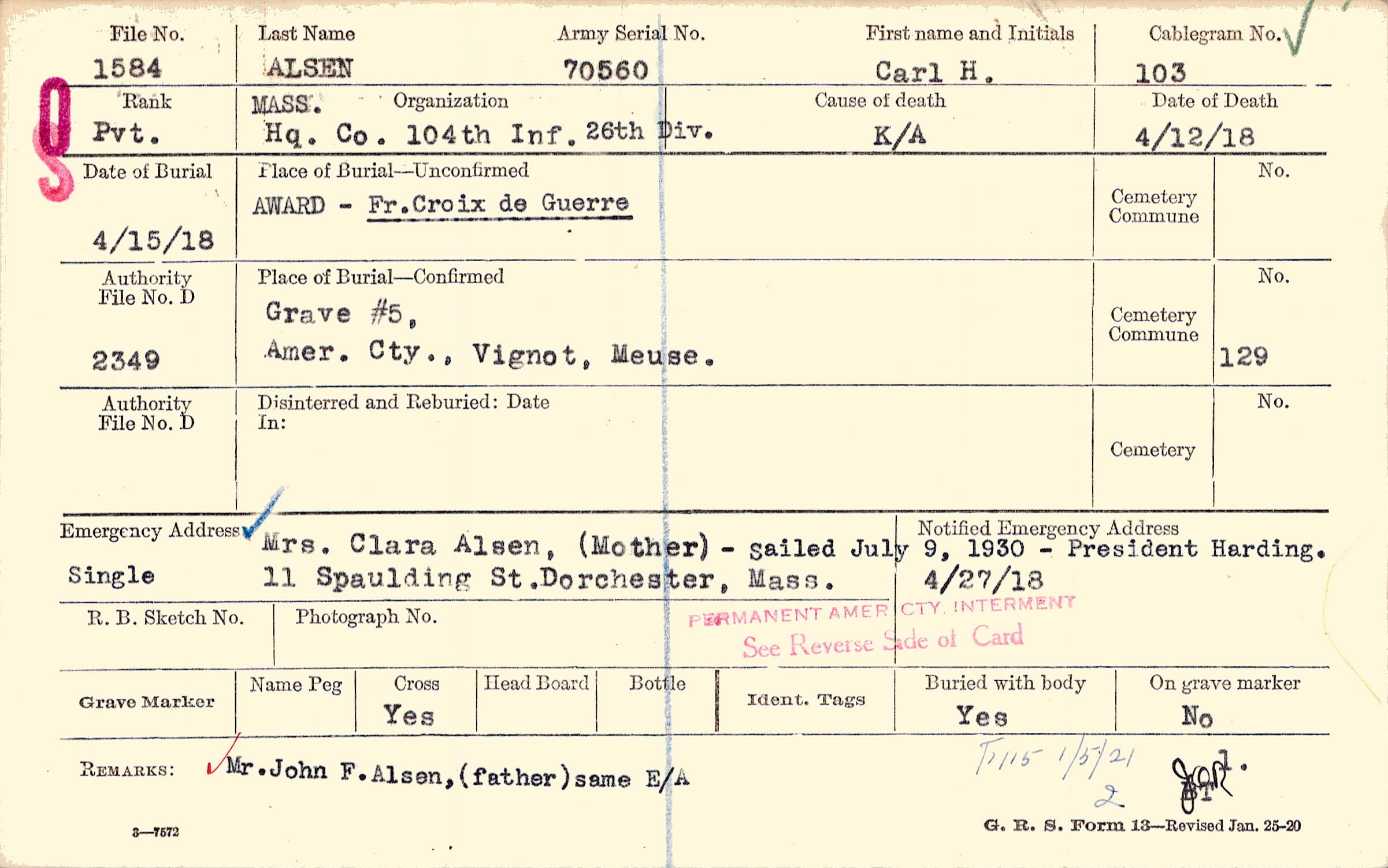 F115 1/5/21 2 Mr. John F. Alsen, (father) same E/A.