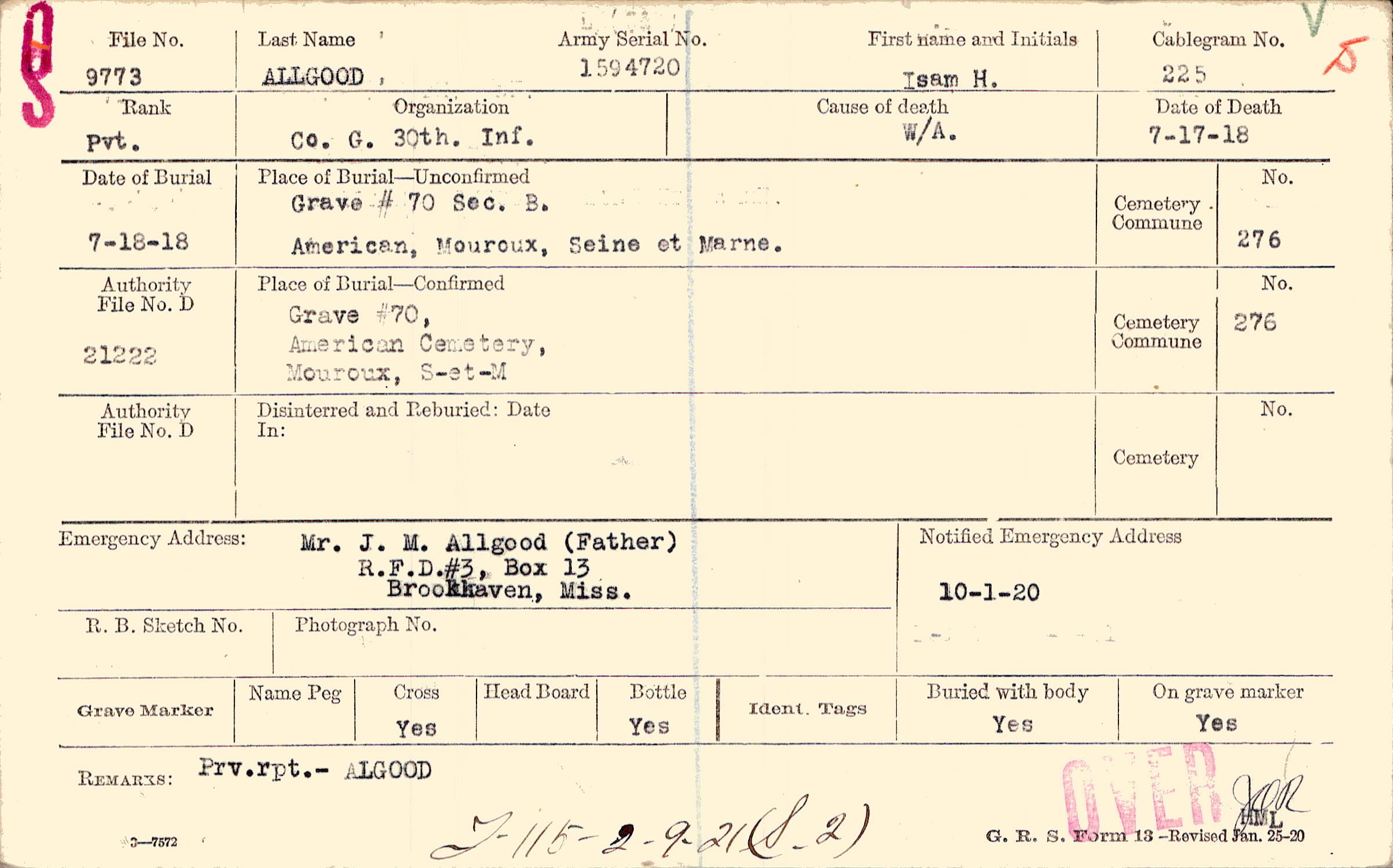 Mr. J. M. Allgood (Father), R.F.D.#3, Box 13 Brookhaven, Miss.