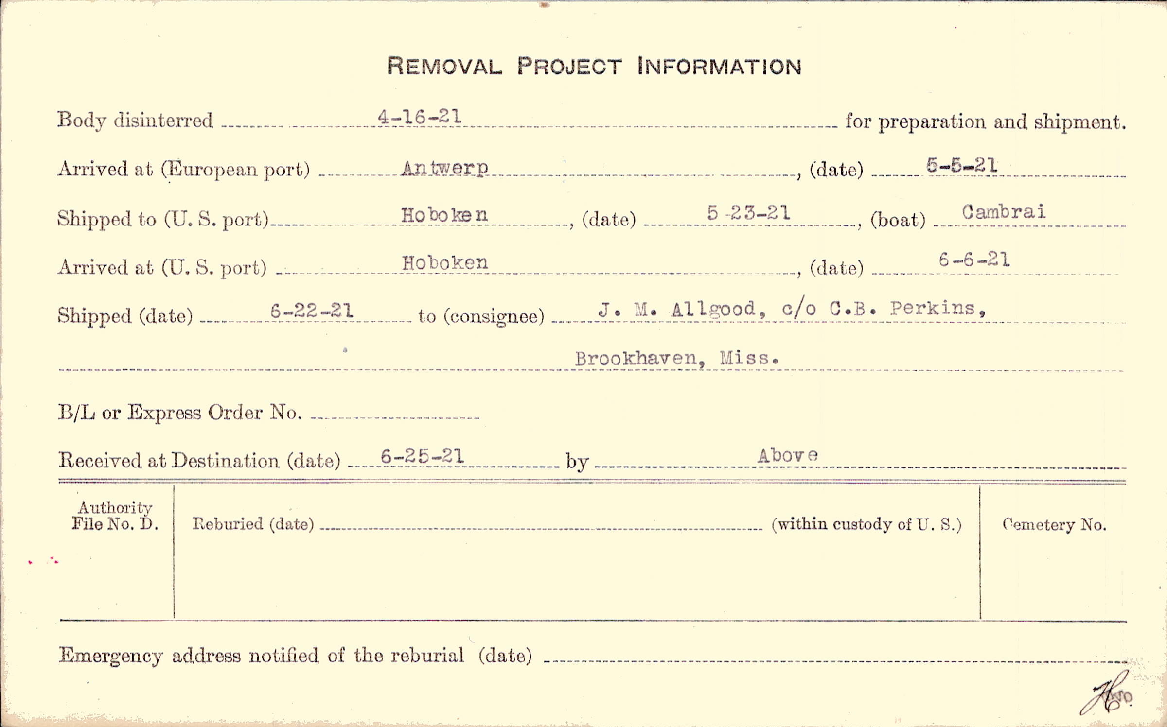Body disinterred 4/16/1921 for preparation and shipment.