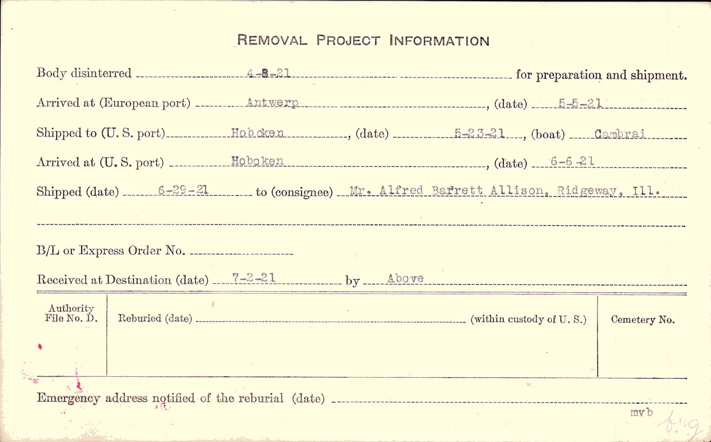 Body disinterred 4/8/1921 for preparation and shipment.