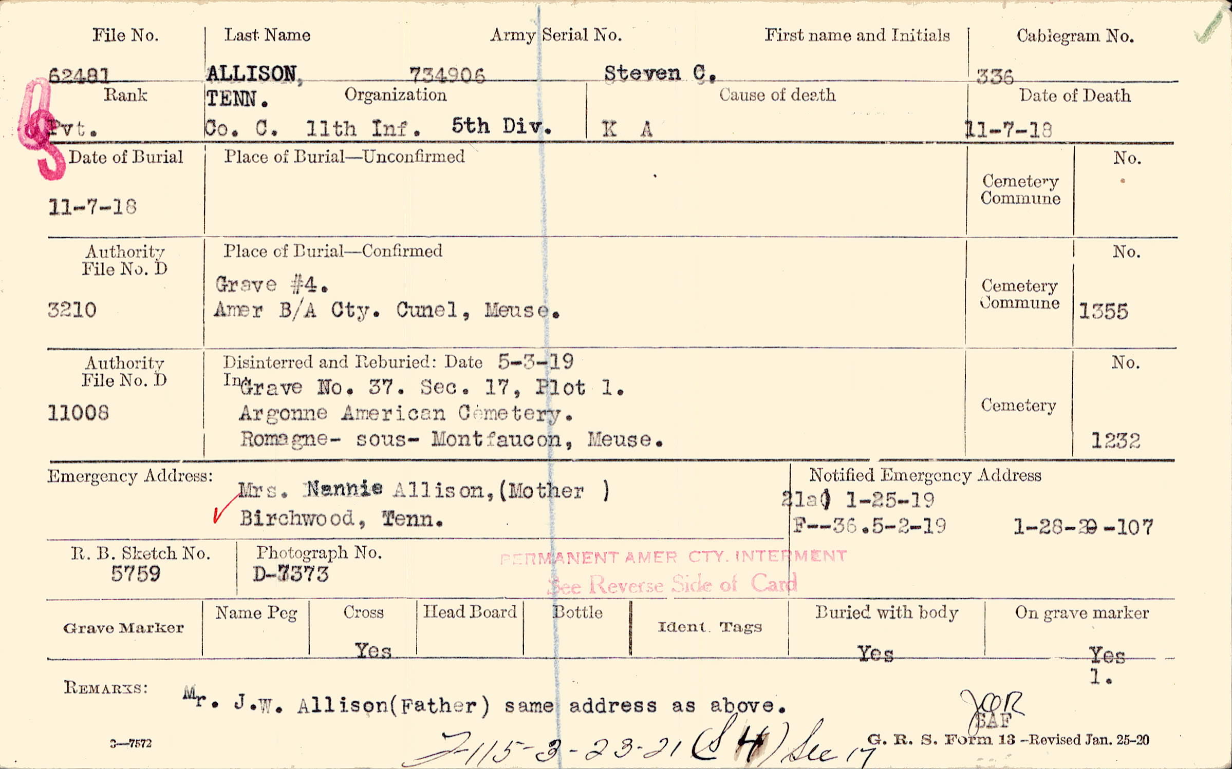 Mr. J. W. Allison (Father) same address as above., F1215 3-23-21 (S4) Sec 17 M.r J.W. Allison (Father) same address as above.
