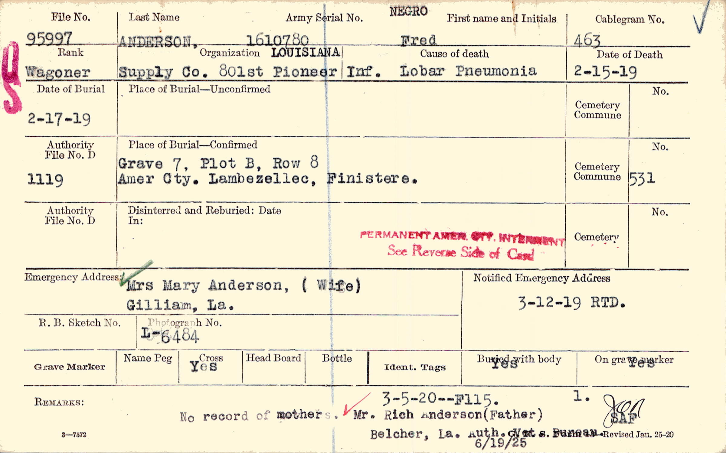 No record of mother Mr. Rich Anderson (Father), Belcher, La. Auth. Vets. Bureau. 6/19/25, 3-5-20--F115.