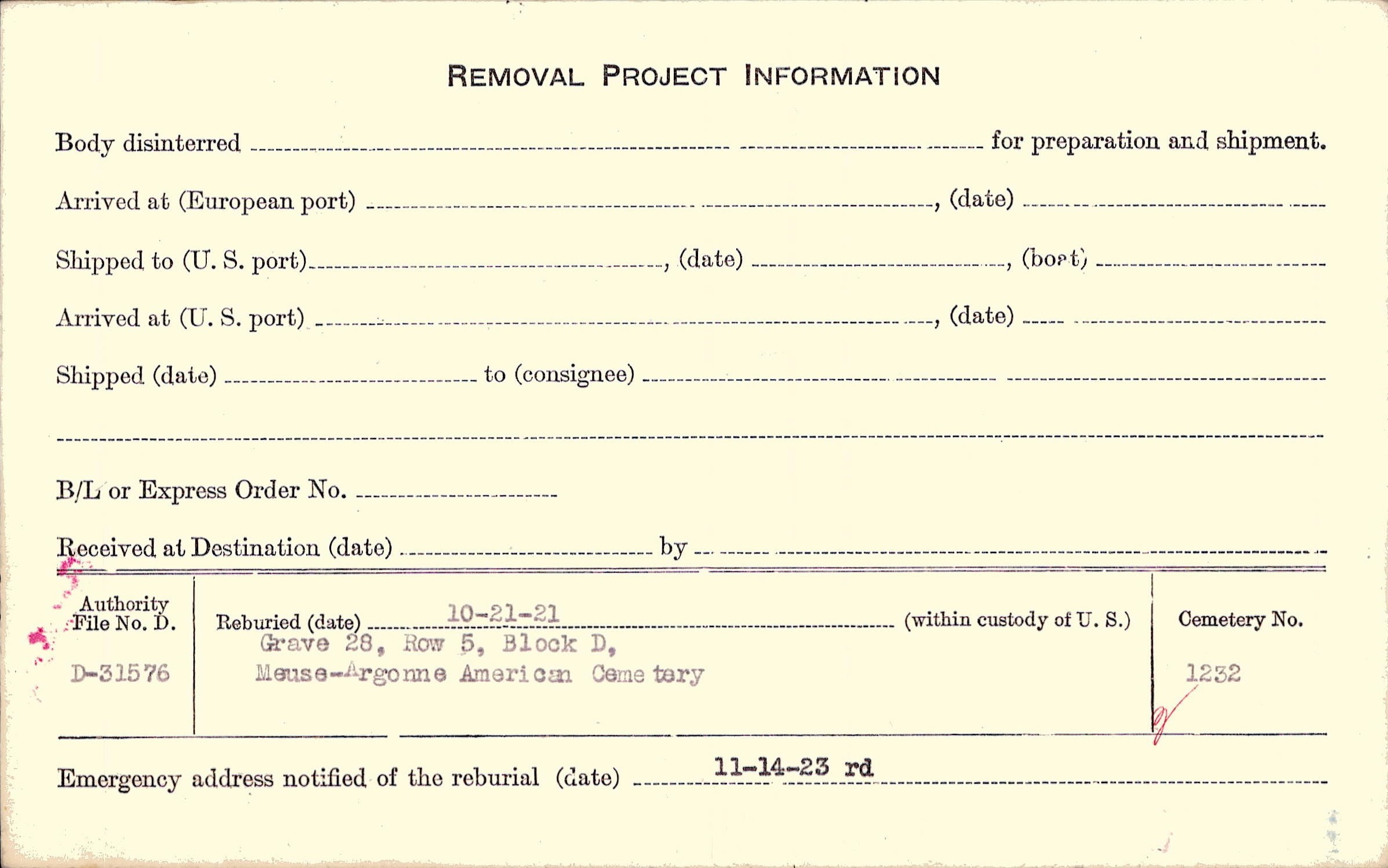 | Permanent Burial in Foreign Cemetery |