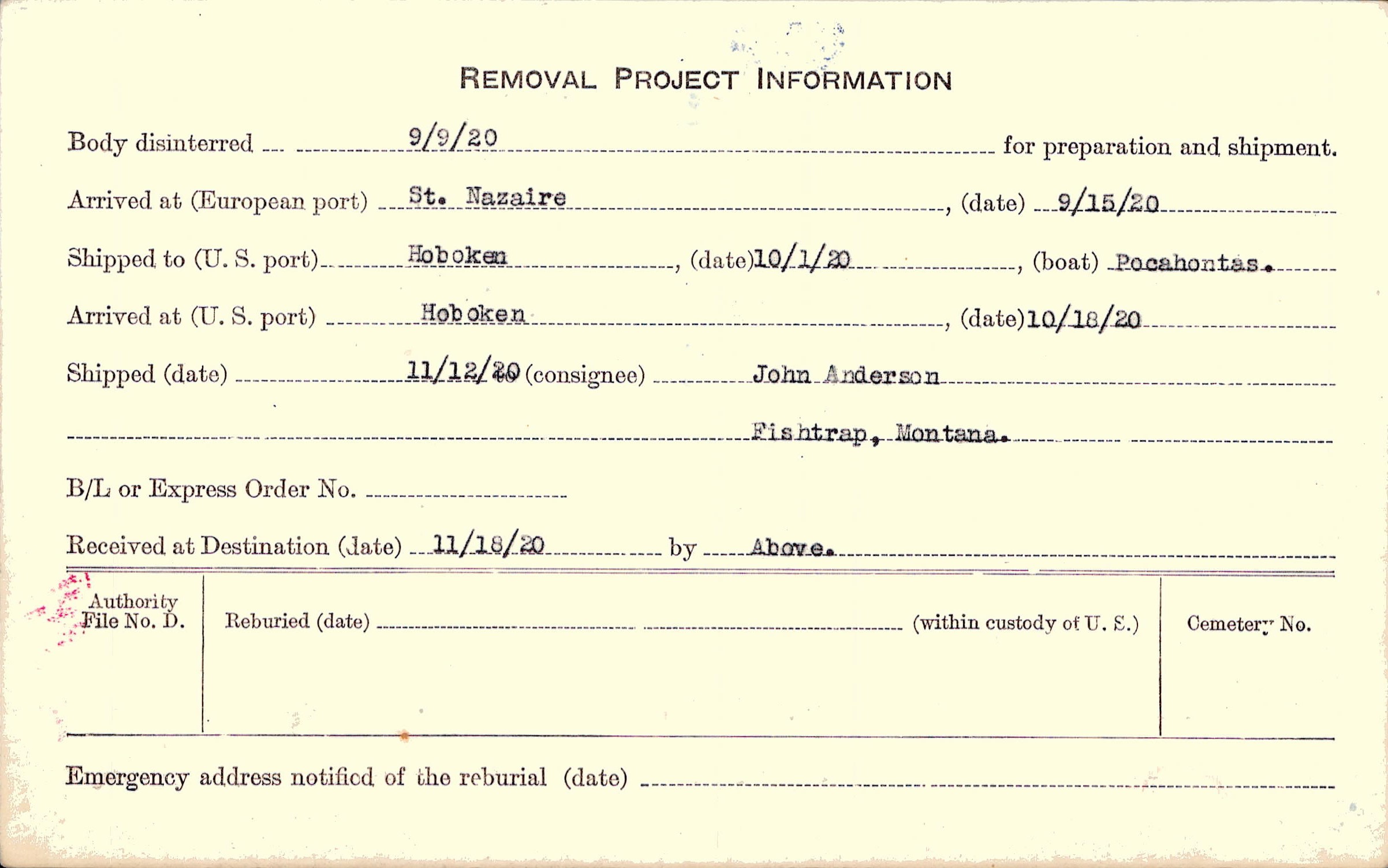 Body disinterred 9/9/1920 for preparation and shipment.