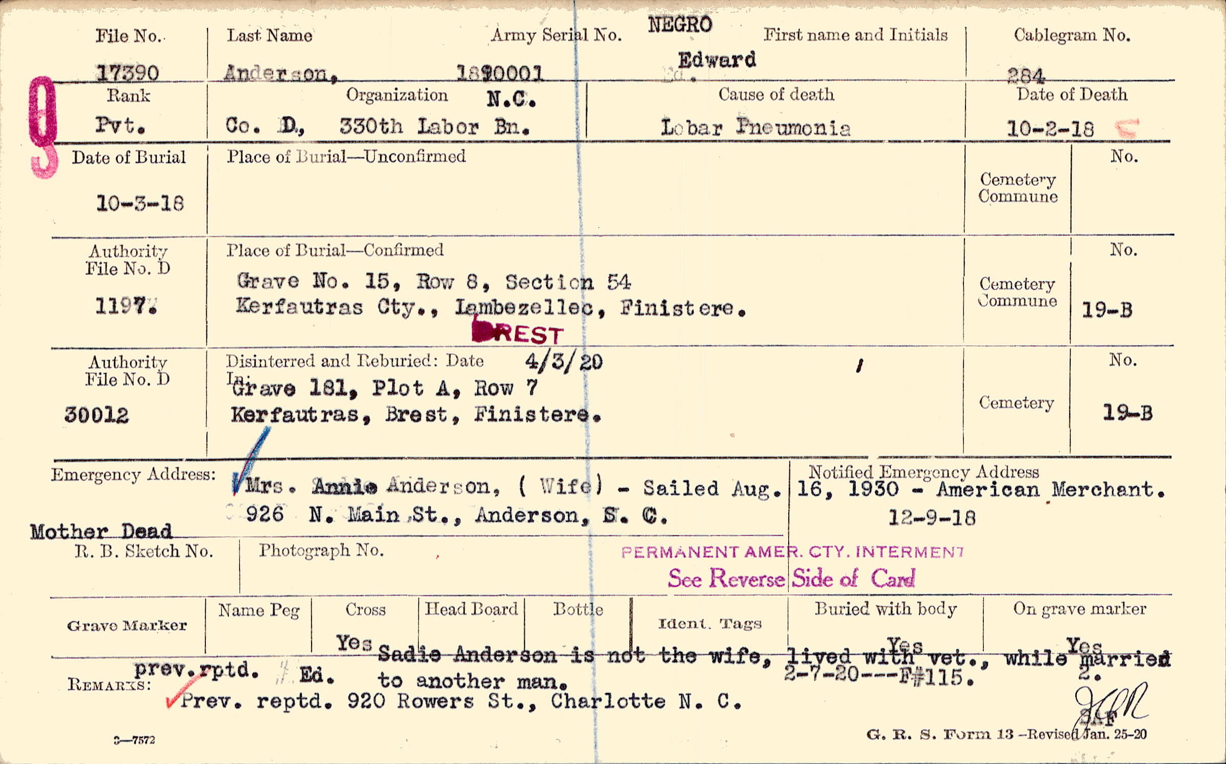 prev. reptd. Ed. Prev. reptd. 920 Rowers St., Charlotte N.C. Sadie Anderson is not the wife, lived with vet., while married to another man., 2-7-20 - F#115.
