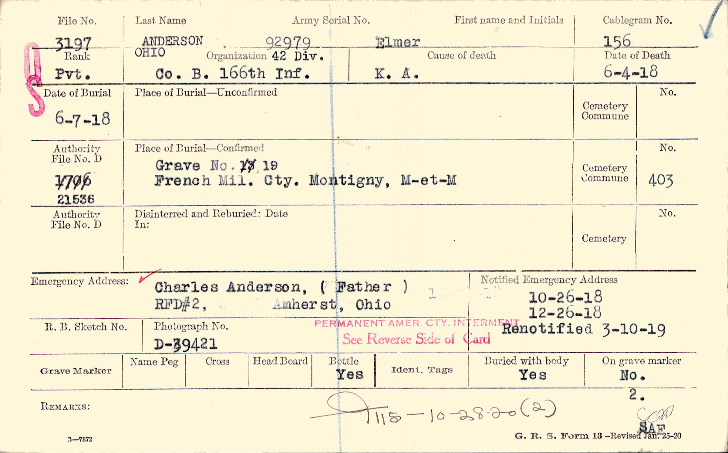 Charles Anderson, (Father), RFD#2, Amherst, Ohio, Permanent Amer. Cty. Interment See Reverse Side of Card