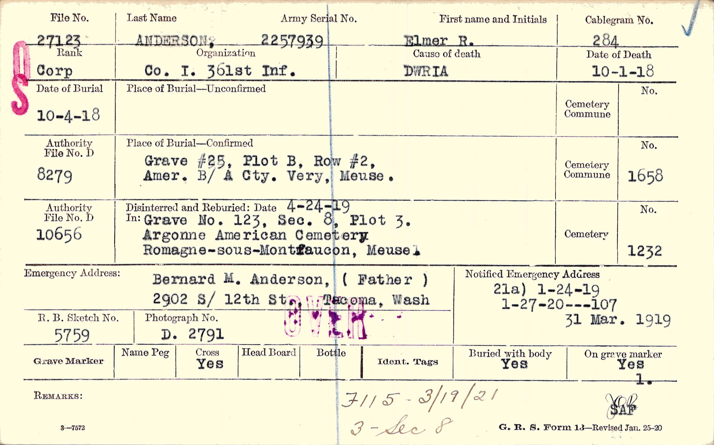 Bernard M. Anderson, (Father), 2901 S/ 12th St . , Tacoma, Wash