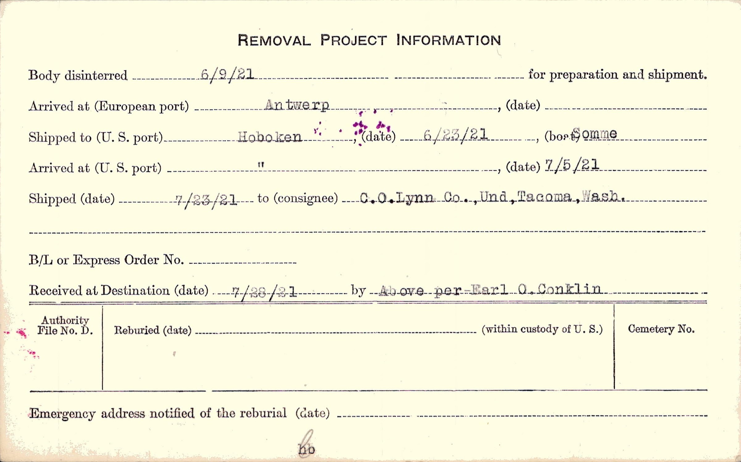 Body disinterred 6/9/1921 for preparation and shipment.