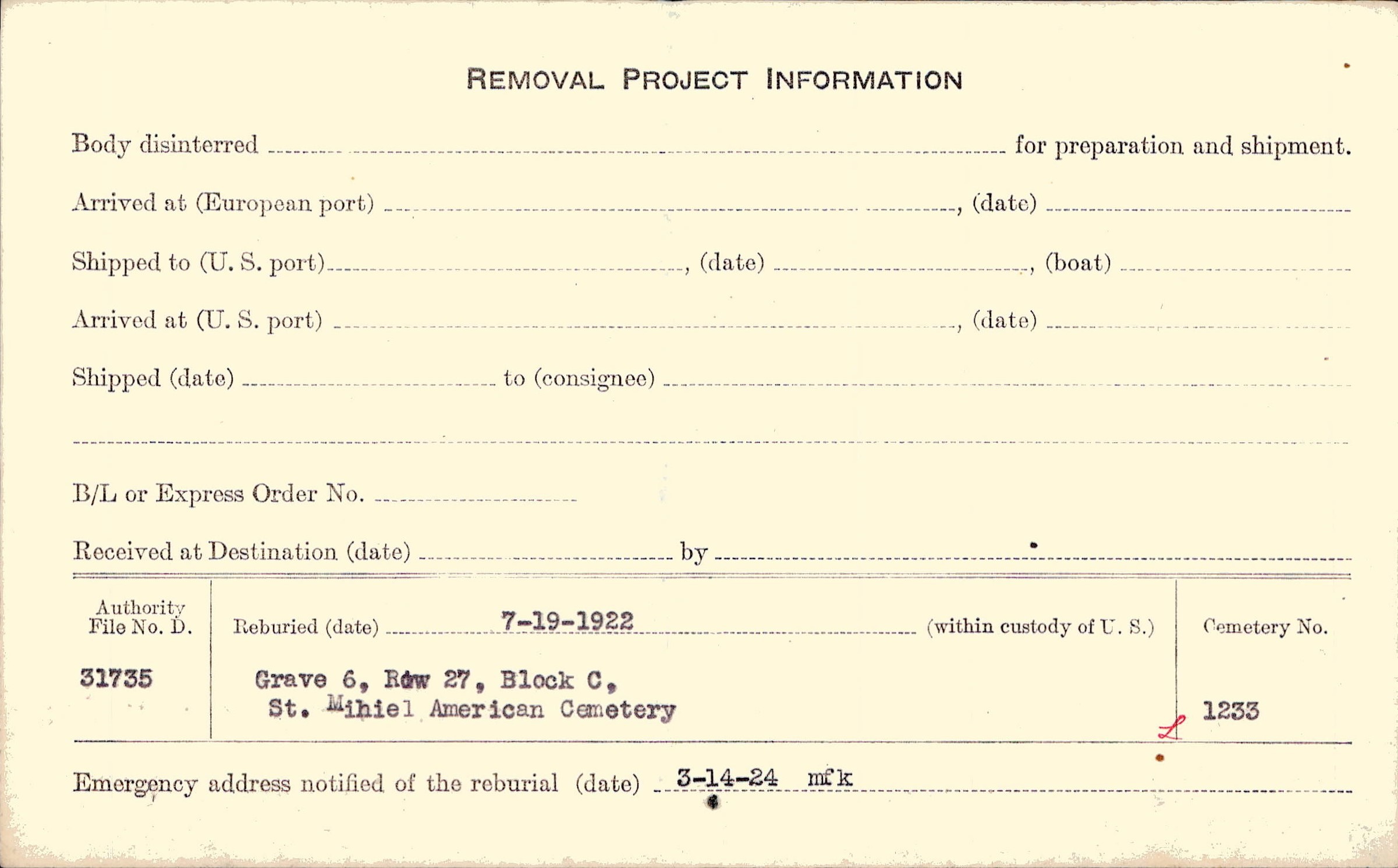 | Permanent Burial in Foreign Cemetery |