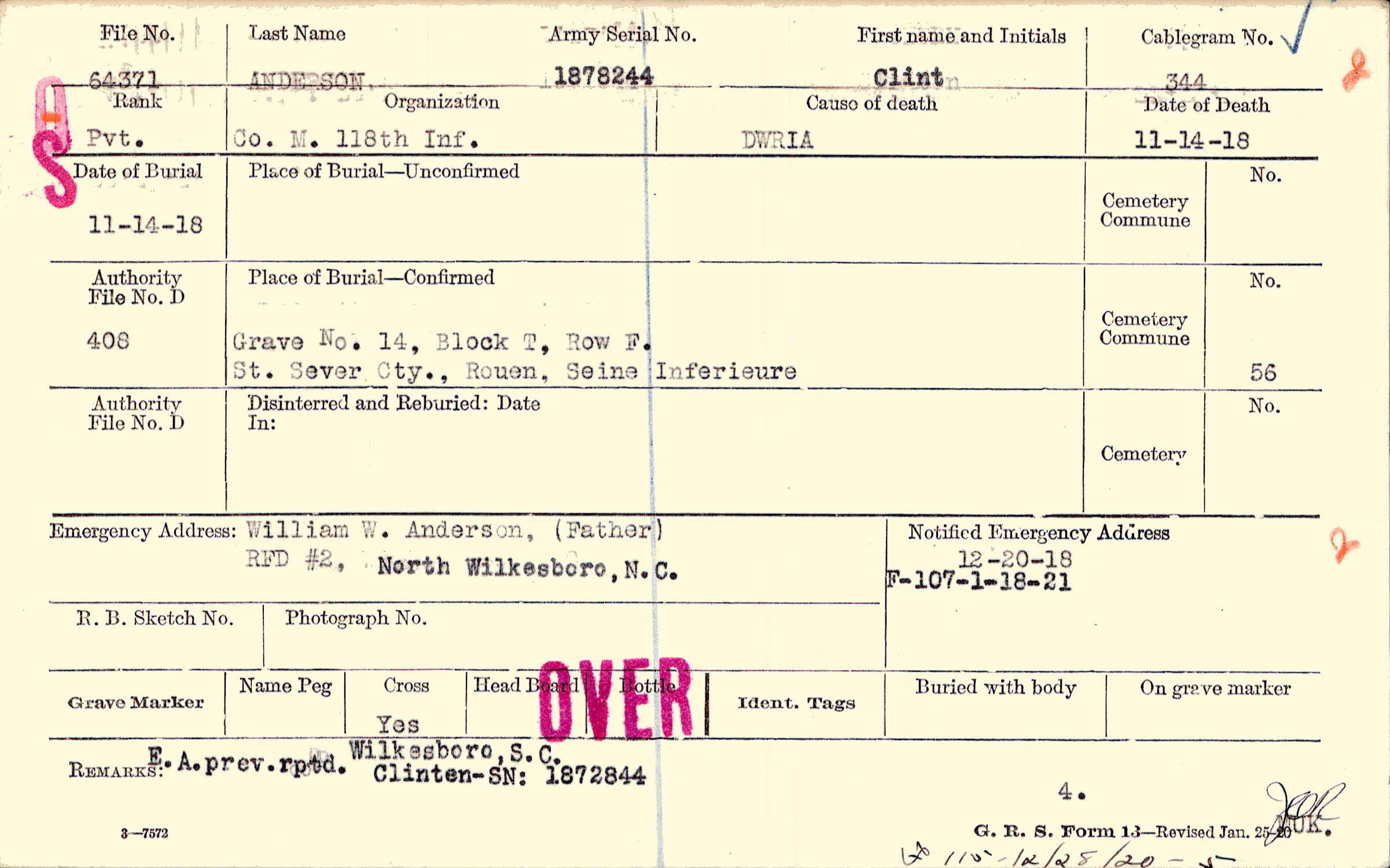 Wilkesboro, S.C. E.A.prev.rptd. Clinten-SN: 1872844, F115-12/25/20-5 E.A. prev. rptd. Wilkesboro, S.C. Clinten-SN: 1872844