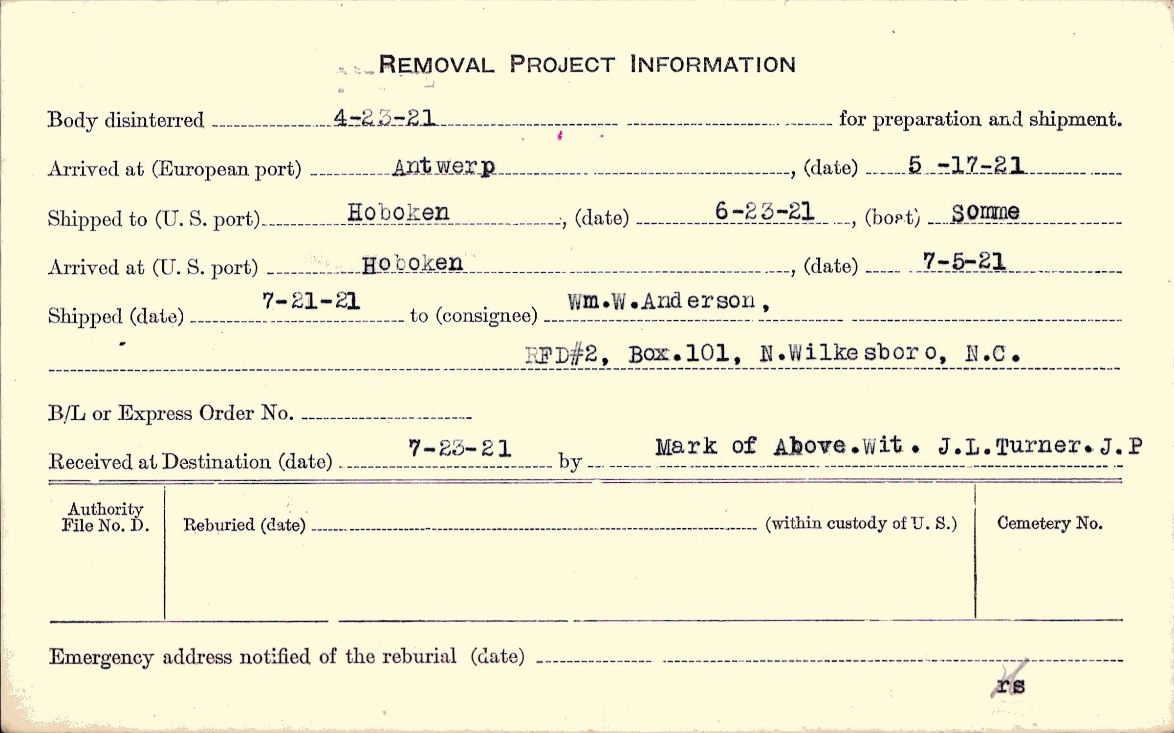 Body disinterred 4/23/1921 for preparation and shipment.