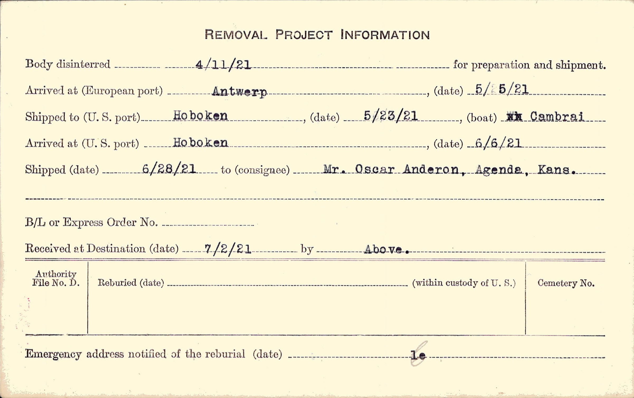 Body disinterred 4/11/1921 for preparation and shipment.