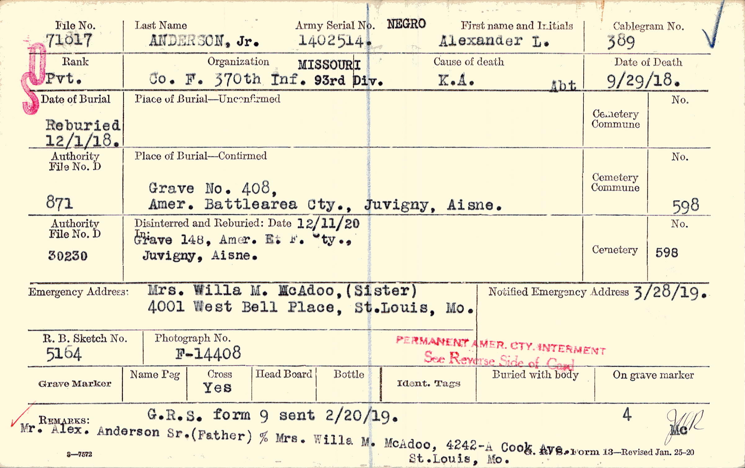 Mr. Alex. Anderson Sr. (Father) % Mrs. Willa M. McAdoo, 4242-A Cook Ave., St. Louis, Mo.
