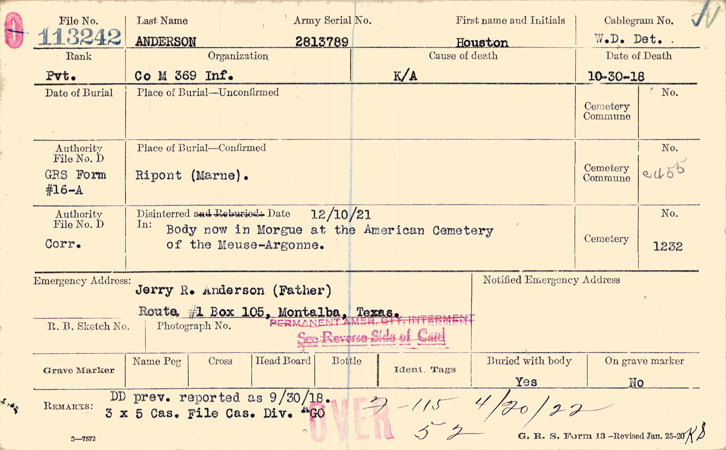 Argonne American Cemetery, Romagne-sous-Montfaucon, Meuse, Body now in Morgue at the