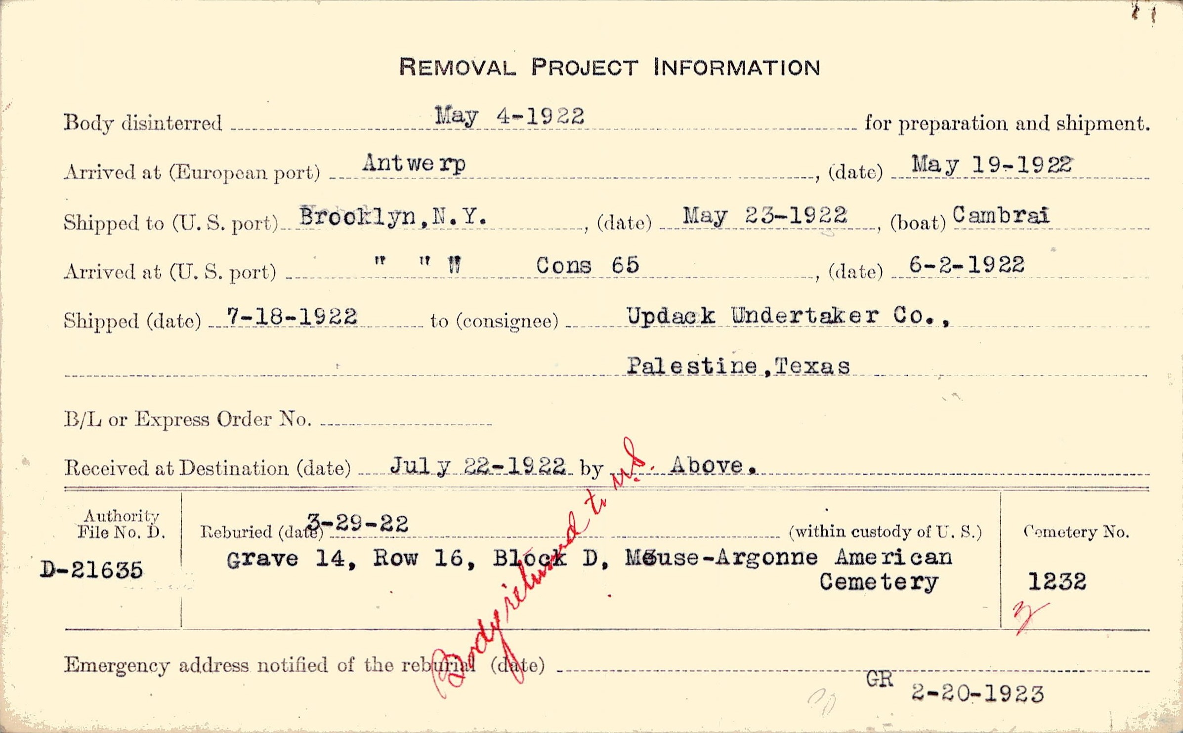 Body disinterred 5/4/1922 for preparation and shipment.