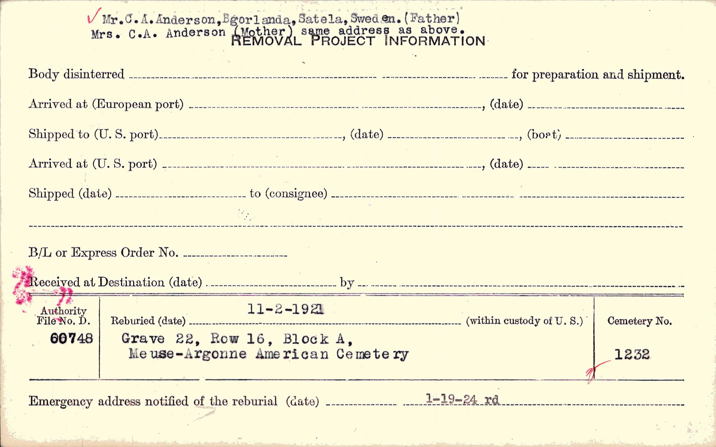 Mr. C.A. Anderson, Bgorlanda, Satela, Sweden. (Father) Mrs. C.A. Anderson (Mother) same address as above. |