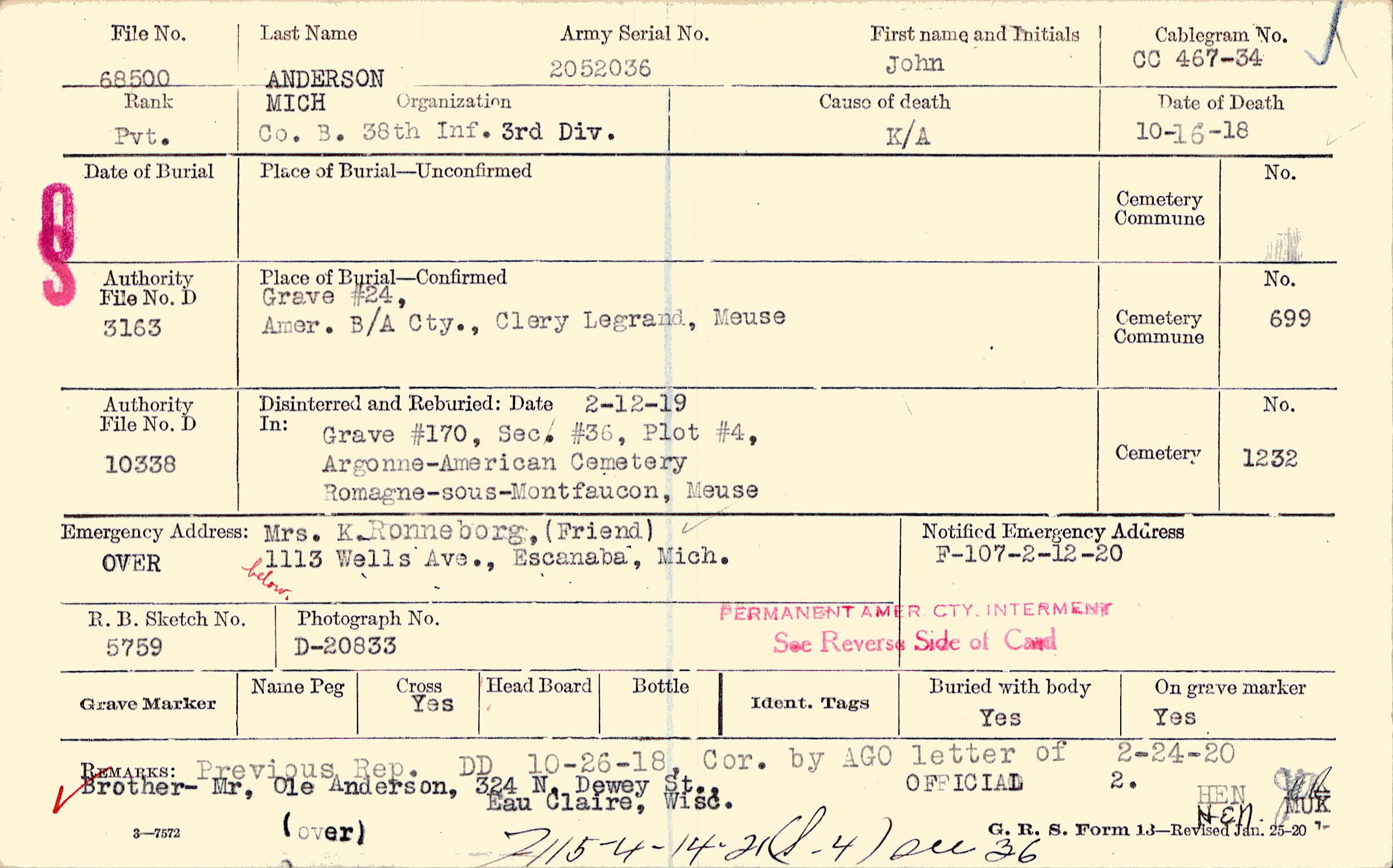 Grave 170, Section 36, Plot 4, Argonne American Cemetery, Romagne-sous-Montfaucon, Meuse