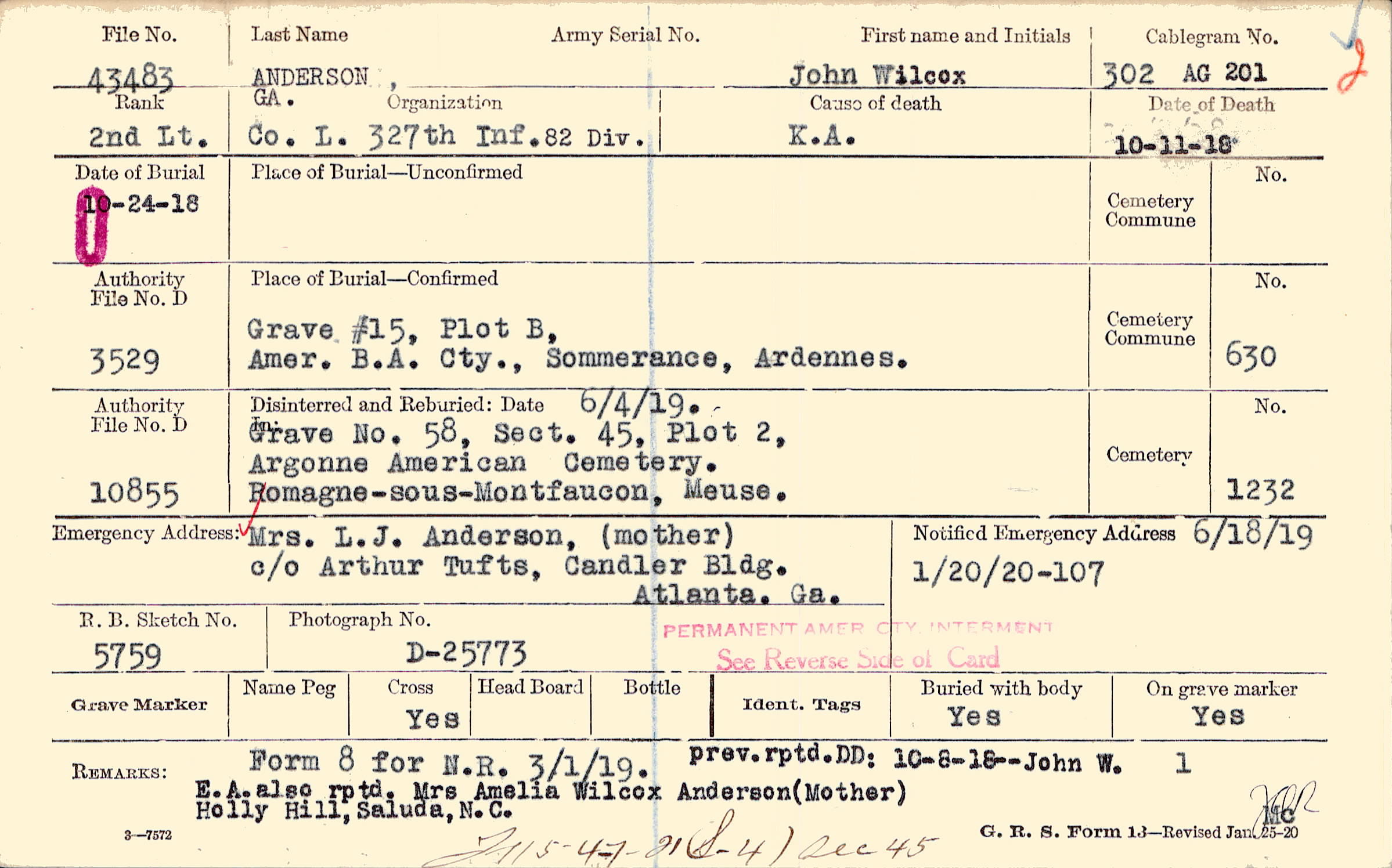 prev. rptd. DD: 10-8-18--John W. E.A. also rptd. Mrs Amelia Wilcox Anderson (Mother), Holly Hill, Saluda, N.C., Form 8 for N.R. 3/1/19., F115 - 4-7-21 (S4) sec 45