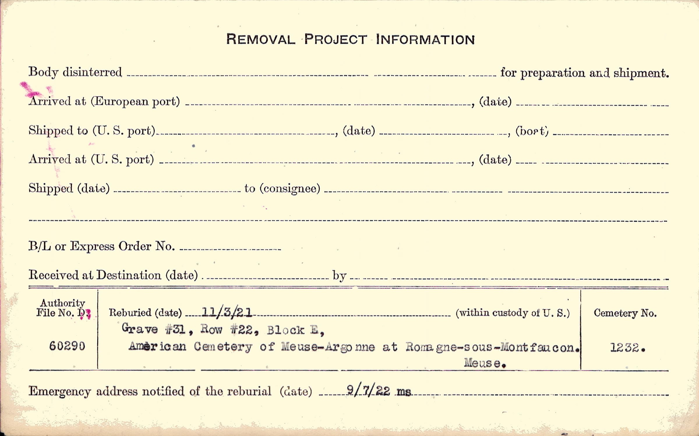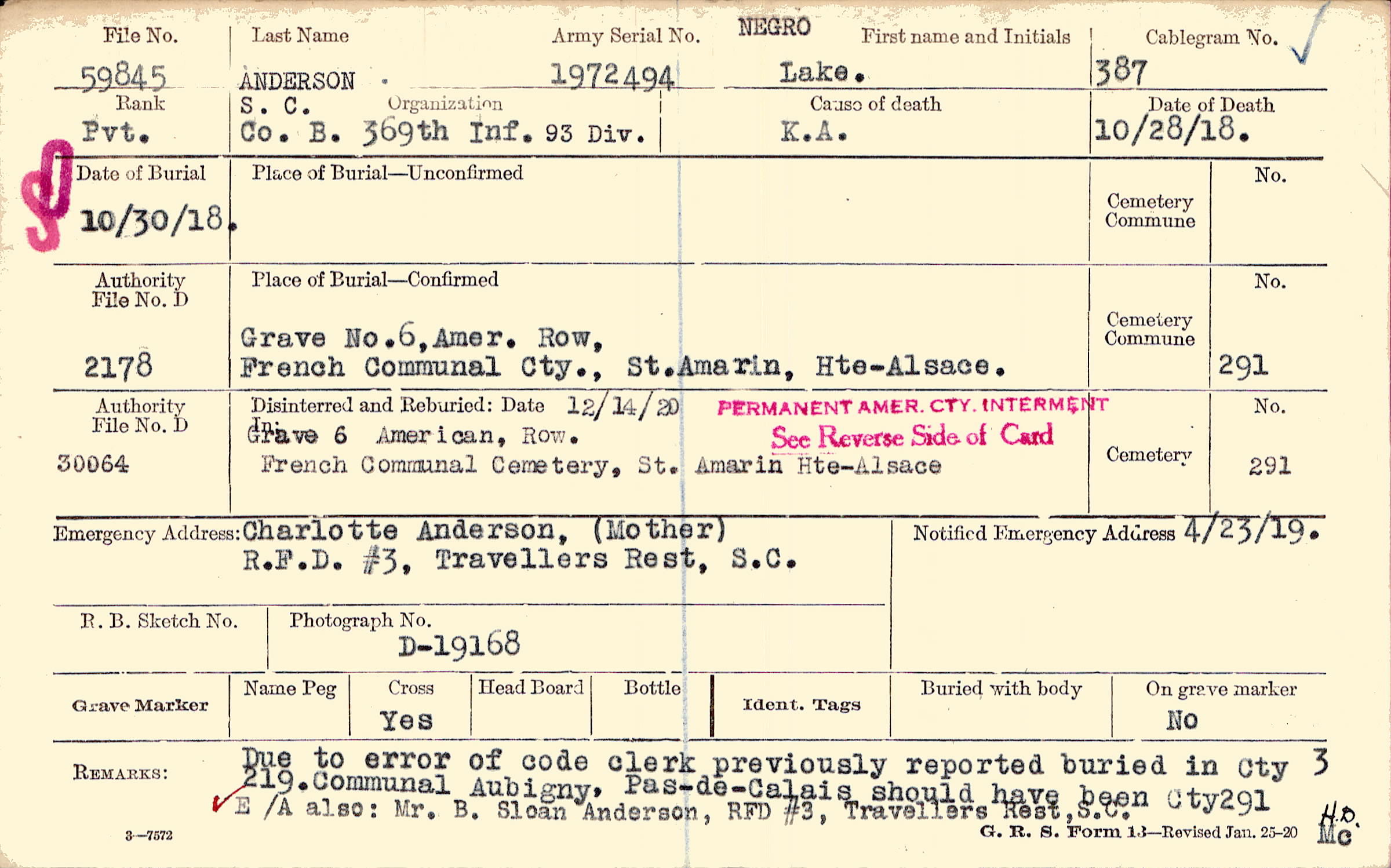 Due to error of code clerk previously reported buried in Cty 219. Communal Aubigny, Pas-de-Calais should have been Cty291 E/A also: Mr. B. Sloan Anderson, RFD #3, Travellers Rest, S.C.